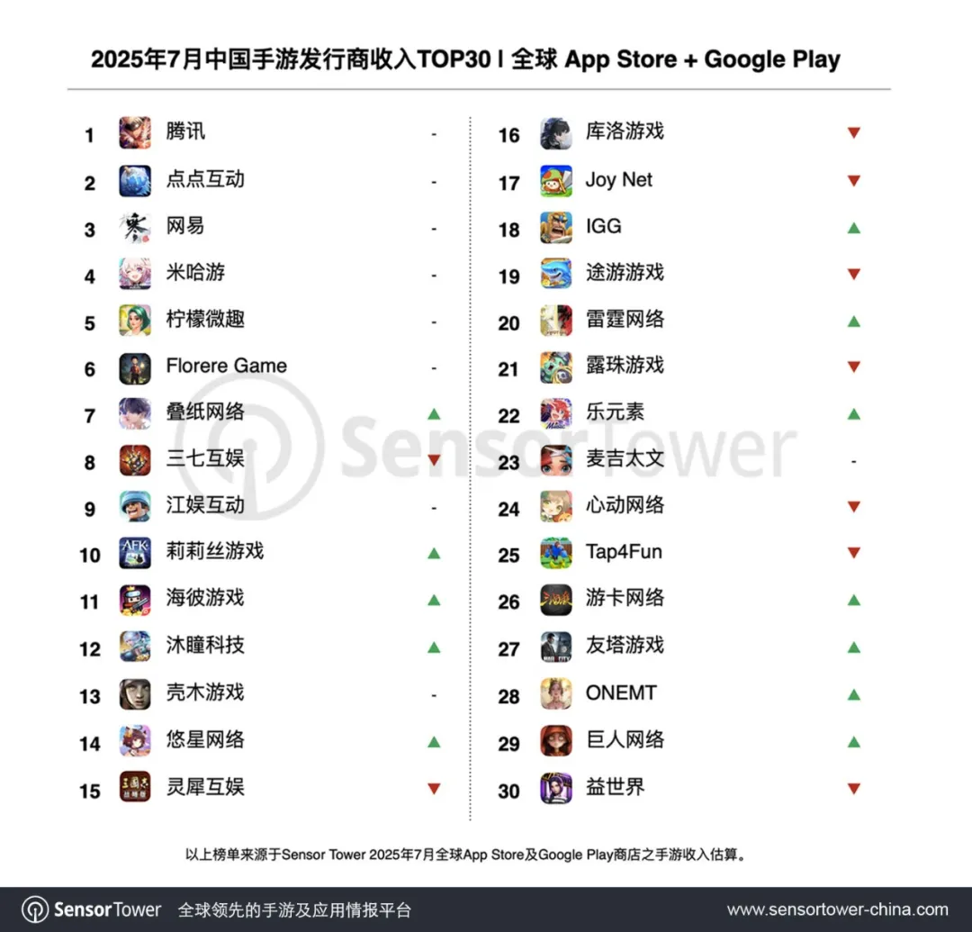 Sensor Tower发布的数据显示,2025年7月,共有32家中国厂商入围全球手游发行商收入榜TOP100,合计收入达到19.5亿美元,占本期全球TOP100手游发行商收入34%。