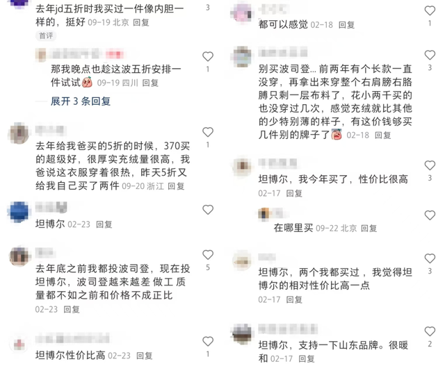 于是,占据大势价格段位,又与波司登同为“中国驰名商标”品牌,更有“中国羽绒行业大国工匠品牌”称号与底蕴的坦博尔,逐渐因突出的性价比优势,吸引了大批从波司登等价格走高品牌转身的消费者。