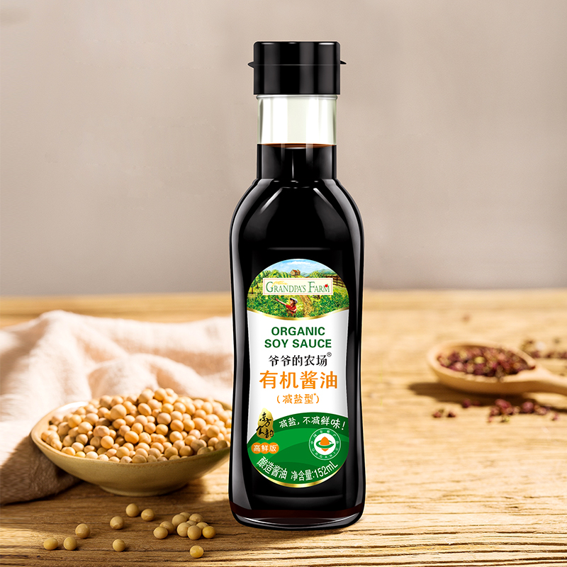 通过广东省食品行业协会团体标准《儿童酱油》(T/GFPU 1008-2023)相关规定可以看出,合格的儿童酱油在其配方纯净度的标准也更高,钠含量也制定了标准,特级酱油钠含量需≤480mg/10ml。以爷爷的农场有机酱油为例,其钠含量为330mg/10ml,不仅较普通酱油显著减少,更低于儿童酱油特级标准中钠含量的要求。同时,其配料表仅包含水、有机非转基因脱脂大豆、有机小麦、有机非转基因大豆和食用盐五种天然食材,无多余添加。