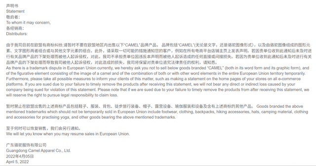 曾经,因品牌logo相似等原因,中国骆驼与美国户外品牌骆驼有过纠缠不清的起源争议。虽然随着中国骆驼的知名度逐渐提高,其品牌独立形象也逐渐增强,但海外市场的相关纠纷并未完全消散。