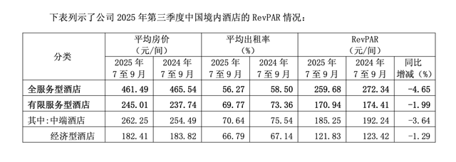 以锦江酒店为例,三季度,锦江酒店旗下中国境内酒店的全服务型酒店的RevPAR为259.68元,同比减少4.65%;有限服务型酒店的RevPAR为170.94元,同比减少1.99%;全服务型酒店的平均房价为461.49元,同比减少0.87%;有限服务型酒店的平均房价约245.01元,同比增长3.06%。