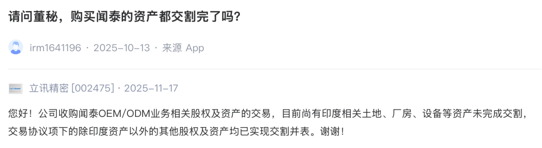去年11月,立讯精密在回应投资者提问时表示,目前目前尚有印度相关土地、厂房、设备等资产未完成交割,交易协议项下的除印度资产以外的其他股权及资产均已实现交割并表。
