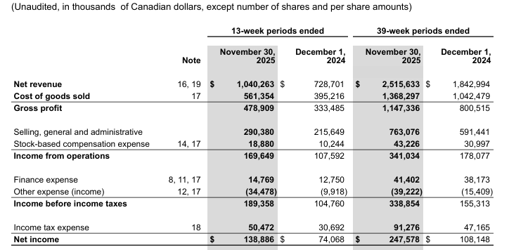 近日,加拿大服装零售商Aritzia公布截至2025年11月30日的2026财年第三季度财报。数据显示,Aritzia期内营收同比增长42.8%至10.4亿美元,实现成立以来首次单季营收突破10亿美元的成就;净收益同比大涨87.5%至1.39亿美元,大幅高于营收增速。