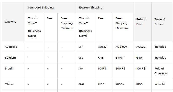 根据官网,中国内地消费者在购买超过800元商品后将可以免运费,退换货费用在100元左右,大概3-6天就可以收货。不同国家或地区的免运费门槛有所不同,例如中国香港需消费满900港元、法国需满110欧元、德国需满230欧元……