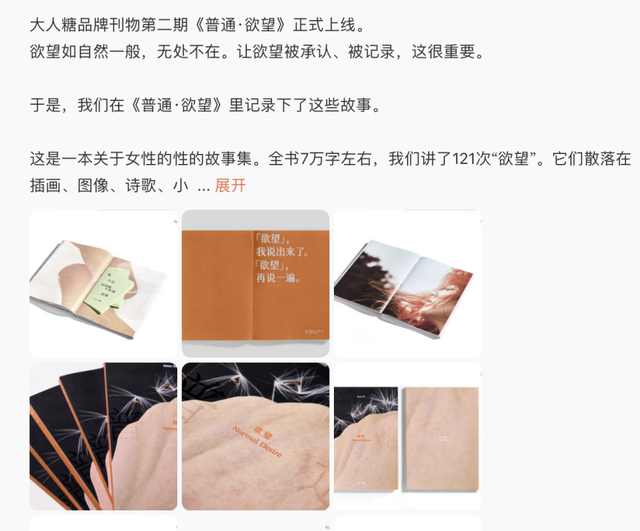 2025年8月,大人糖在常州市的中华性文博物馆举办了一场女性愉悦展,其中用便签夹、冰箱贴以及浴巾等周边来进行女性性学知识的普及;12月,大人糖还在杭州万象天地的门店中举办了名为“晒晒欲望”的展览,展出了品牌迄今出版的两本杂志《普通身体》和《普通欲望》。