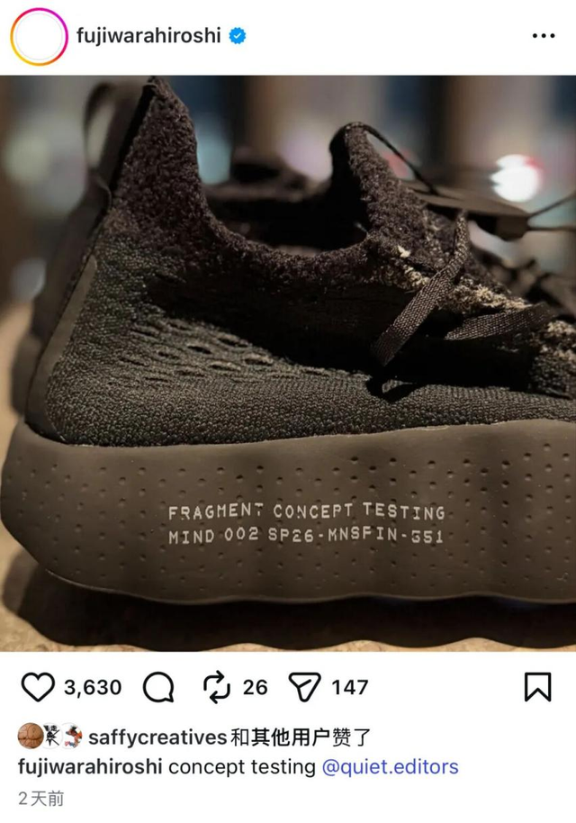 但鞋履方面设计师的新作似乎难以受到消费者青睐。以藤原浩近日曝光的Fragment x Nike Mind 002为例,根据释出的预览图片,该联名款整体采用Flyknit鞋面,并用到拼接结构和外露缝线强调设计感。