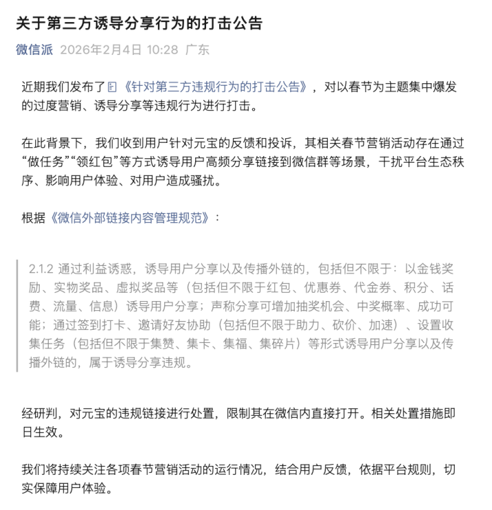 2月4日,微信官方账号“微信派”发文称,近期发布了《针对第三方违规行为的打击公告》,对以春节为主题集中爆发的过度营销、诱导分享等违规行为进行打击。其中,其收到用户针对元宝的反馈和投诉,其相关春节营销活动存在通过“做任务”“领红包”等方式诱导用户高频分享链接到微信群等场景,干扰平台生态秩序、影响用户体验、对用户造成骚扰。