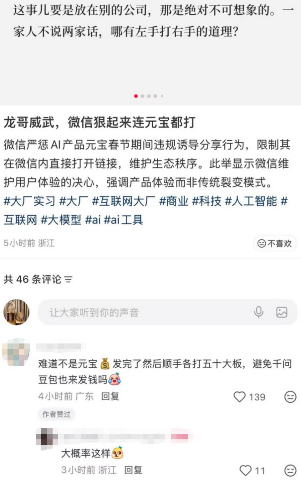 作为亲兄弟,微信封禁元宝一事也引发激烈讨论。有观点认为,微信守住了底线,符合其产品价值观。