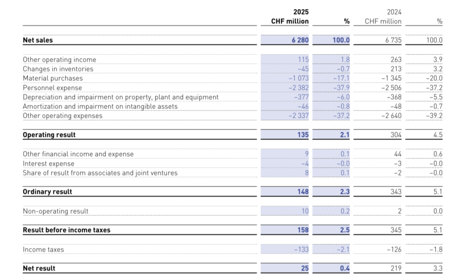 不久前,斯沃琪集团发布了2025年全年业绩。财报显示,集团净销售额达62.8亿瑞士法郎,按固定汇率计算同比下降1.3%(按当前汇率计算同比下降5.9%);集团净利润从2024年的2.19亿瑞郎暴跌88.6%至2500万瑞郎,净利润率仅剩0.4%。