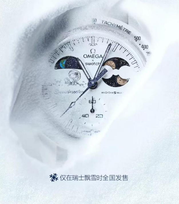 为了进一步推高热度,斯沃琪甚至玩起了“玄学营销”:比如首创“只在下雪天开售”的特殊版本,或者仅在满月之夜发售的 Mission to Moonshine Gold。开售时都曾有过一些小爆款的“高光”。