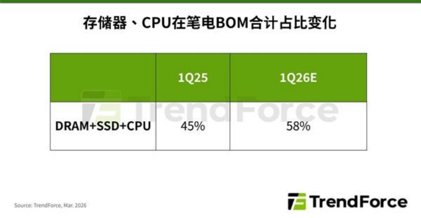 图示:集邦咨询数据显示,今年一季度DRAM+SSD+CPU的成本占比将会上涨至58%