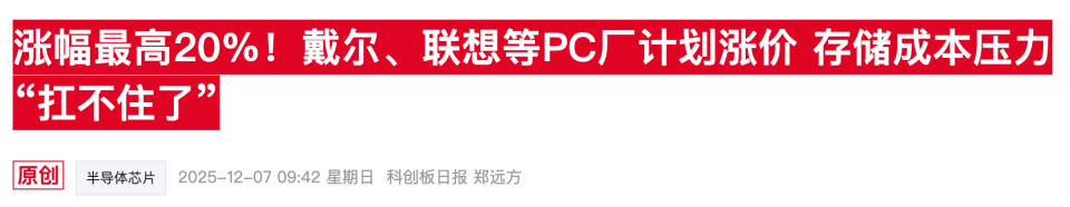 据多家媒体综合报道,2026年以来大批电脑厂商陆续开启调价进程。联想此前向渠道商下发调价函,决定对旗下部分电脑产品进行价格上调,其中部分高端商用笔记本价格上调20%,部分型号终端零售价涨幅最高超过1000元;华硕宣布将旗下所有笔记本价格上调15%—25%;宏碁部分机型涨幅达10%—20%;戴尔、惠普等厂商也在同步酝酿跟进涨价。