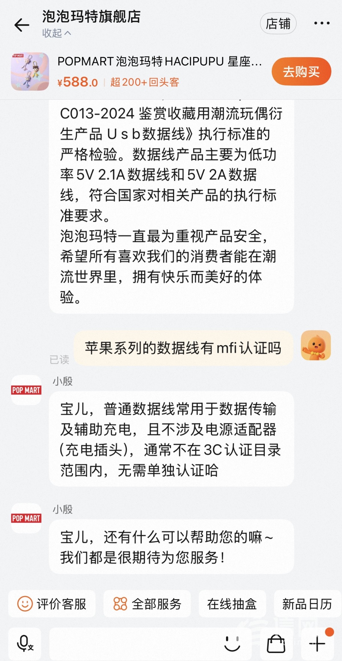 泡泡玛特旗舰店对数据线相关认证信息回复 (来源:信网)