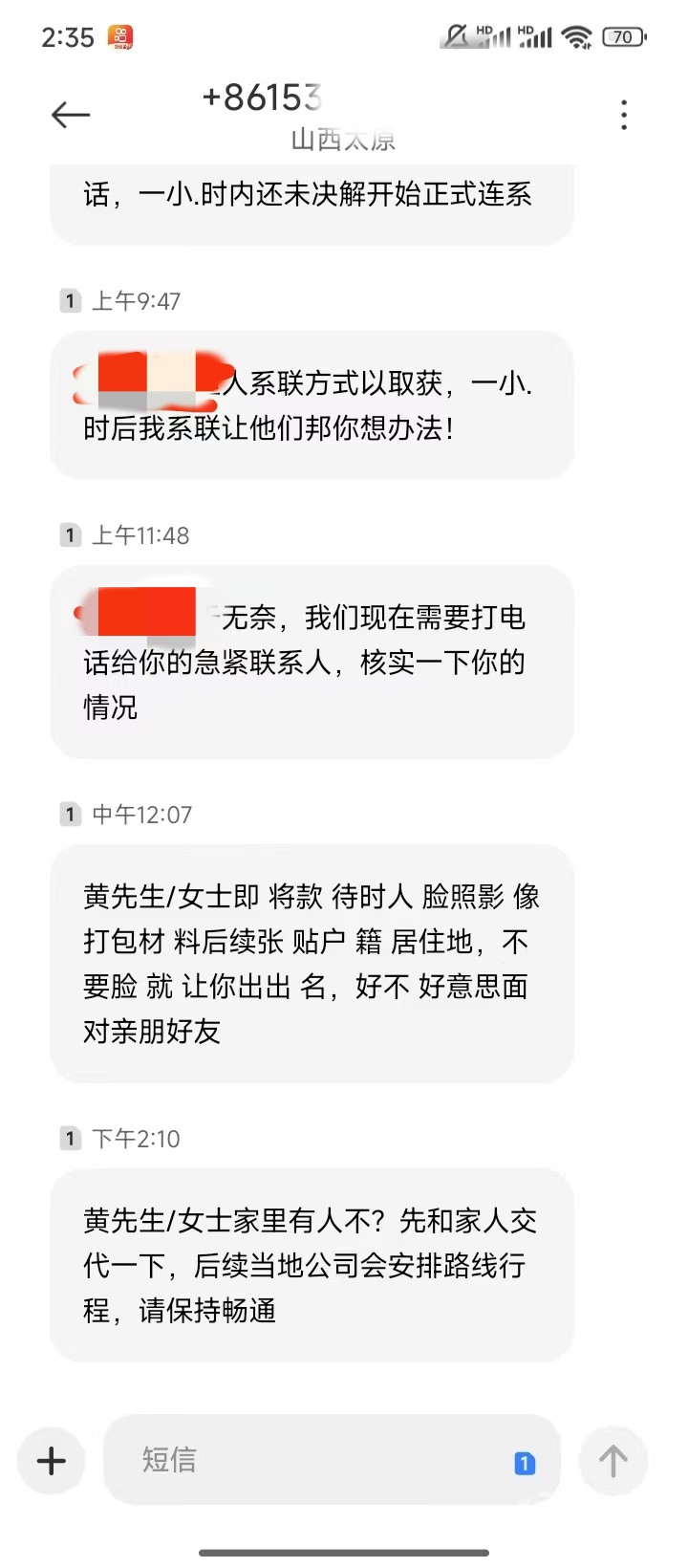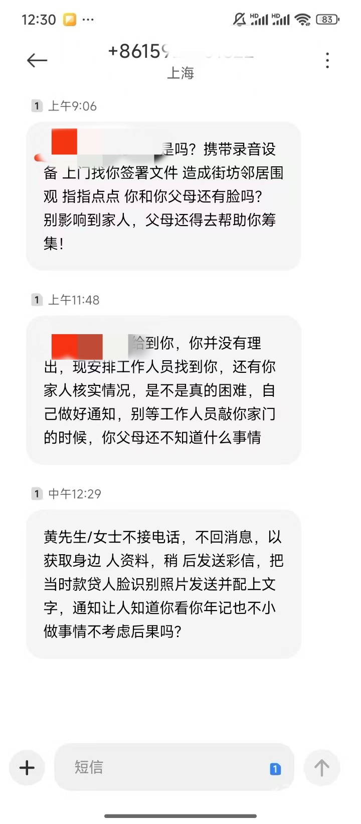 根据黄女士向信网提供的短信截图记录显示,使用上海号码的催收人员于上午9:06发送短信称“携带录音设备上门找你签署文件,造成街坊邻居围观指指点点,你和你父母还有脸吗?”上午11:48又表示“现安排工作人员找到你。”12:29催收人员进一步表示,已获取黄女士身边人的资料,稍后要将她贷款时的人脸识别照片发送出去,并配上文字。