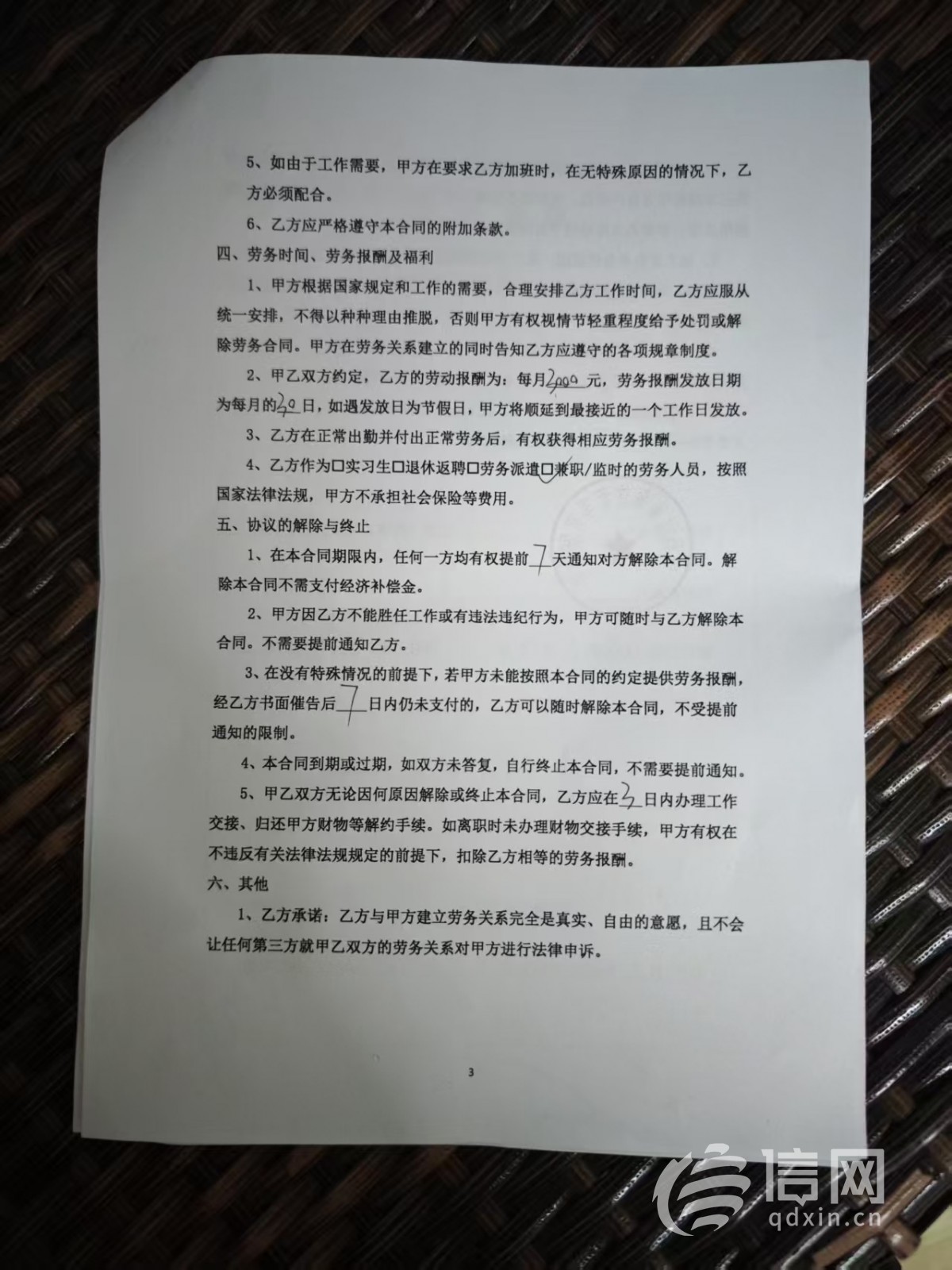 徐女士是一名刚刚毕业的大学生,今年1月由于需要完成学校的实习任务,所以通过朋友介绍来到汉卓酒店应聘面点师的工作。“当时我还没有毕业,是为了完成实习任务,但也签了劳务合同。”根据徐女士提供的劳务合同,信网看到合同约定方为青岛汉家餐饮管理有限公司(以下简称“青岛汉家”),据了解,汉卓酒店为汉家旗下产业,合同期限为一年,约定报酬为每月3000元,每月月底按时发放。