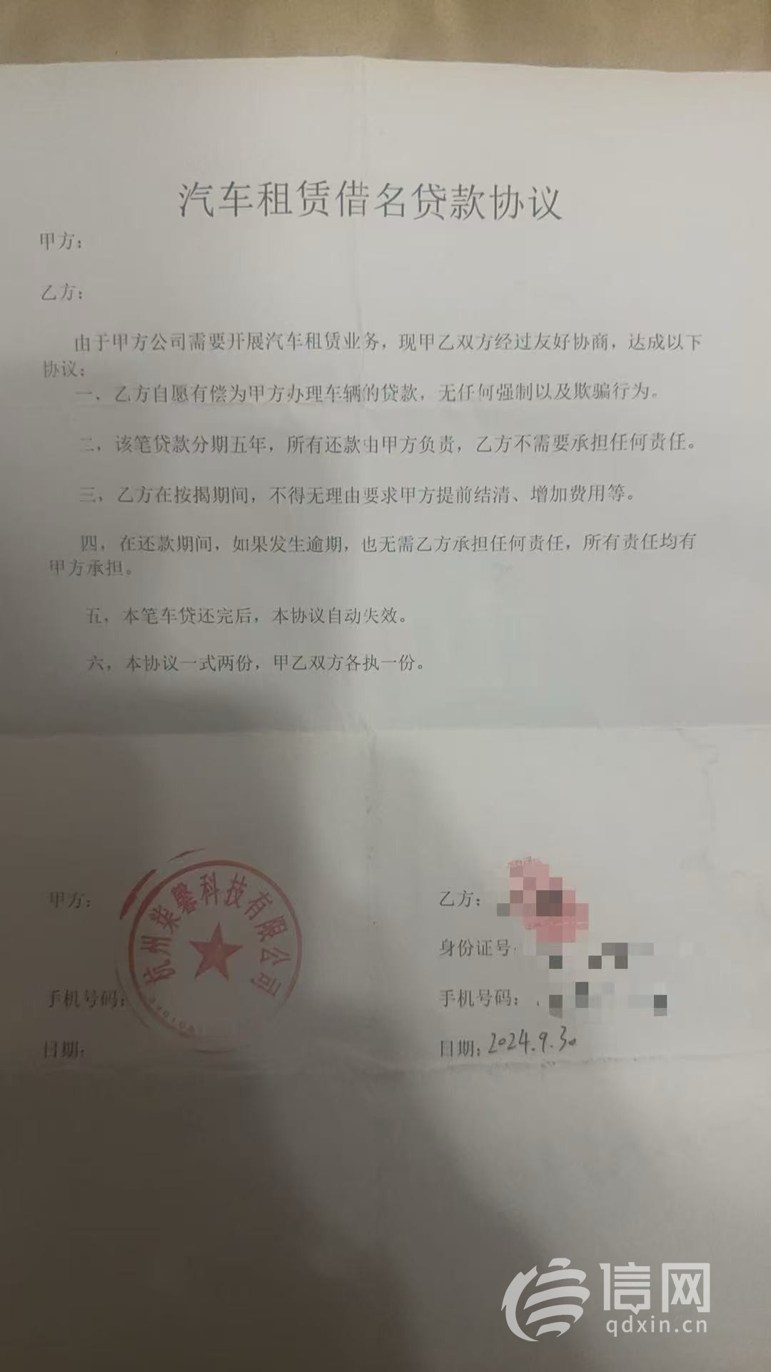 “协议是我去他们公司签的,办公室是在个大写字楼里,有200多平方米。我去的时候有五六个人上班,说其他人都出去跑业务了。”郑先生说,自己签的是一份“汽车租赁借名贷款”协议,双方约定首付和贷款都由柒馨科技出,郑先生不需要承担任何责任,而且还能获得4000元的报酬。