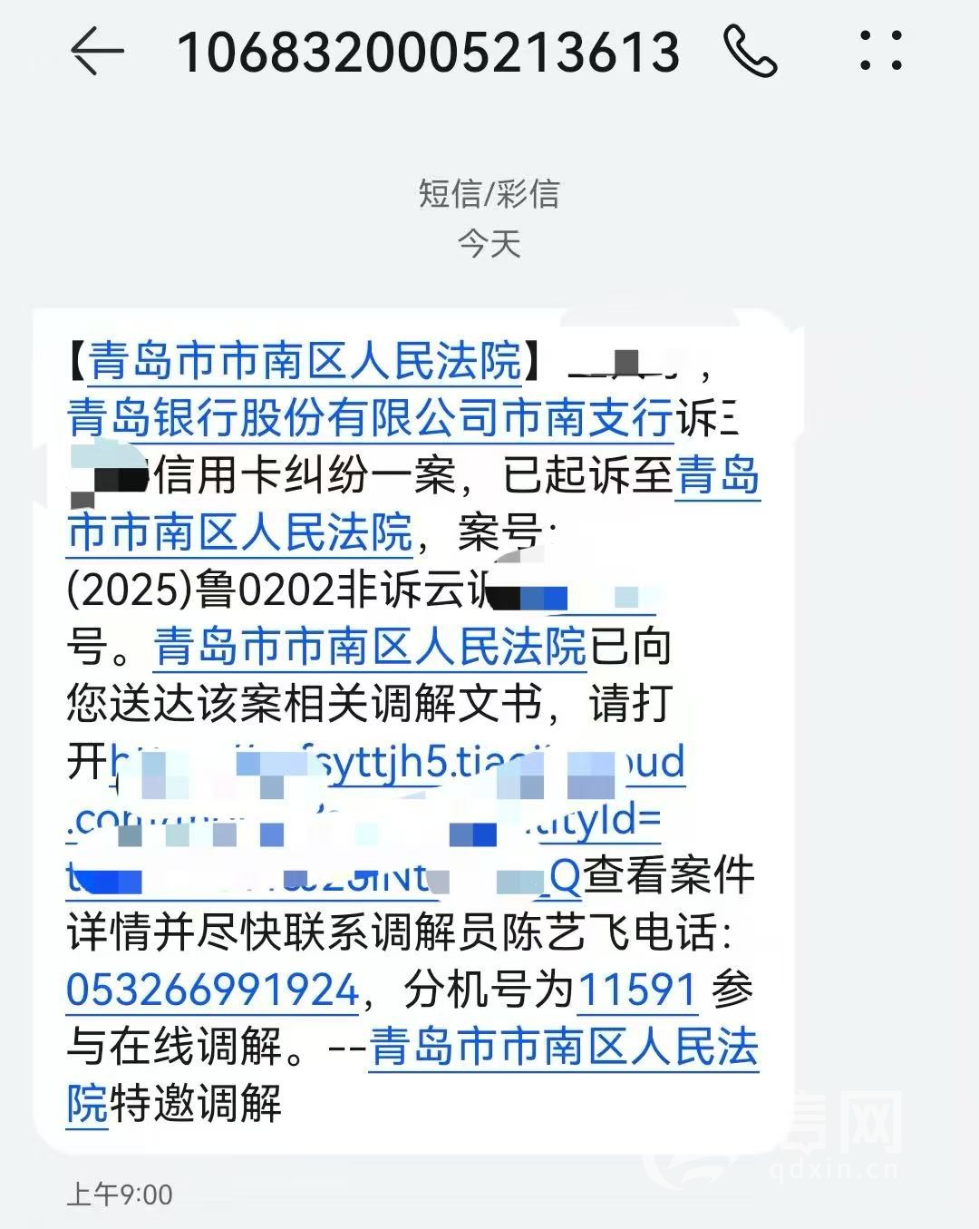 王先生介绍,自己因信用卡逾期未还款与银行产生纠纷。日前,他收到一条1068开头的短信,内容显示为“【青岛市市南区人民法院】……信用卡纠纷一案已起诉至青岛市市南区人民法院,案号:(2025)鲁0202非诉云调……青岛市市南区人民法院已向您送达该案相关调解文书……”附带网址及调解员的电话分机号,落款为青岛市市南区人民法院特邀调解。