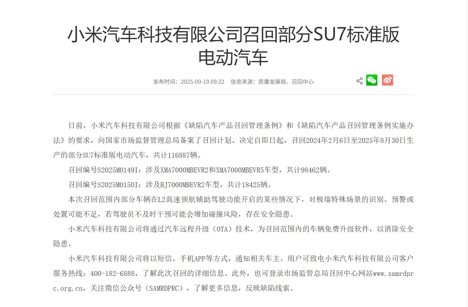 信网9月19日讯 日前,小米汽车科技有限公司根据《缺陷汽车产品召回管理条例》和《缺陷汽车产品召回管理条例实施办法》的要求,向国家市场监督管理总局备案了召回计划。决定自即日起,召回2024年2月6日至2025年8月30日生产的部分SU7标准版电动汽车,共计116887辆。