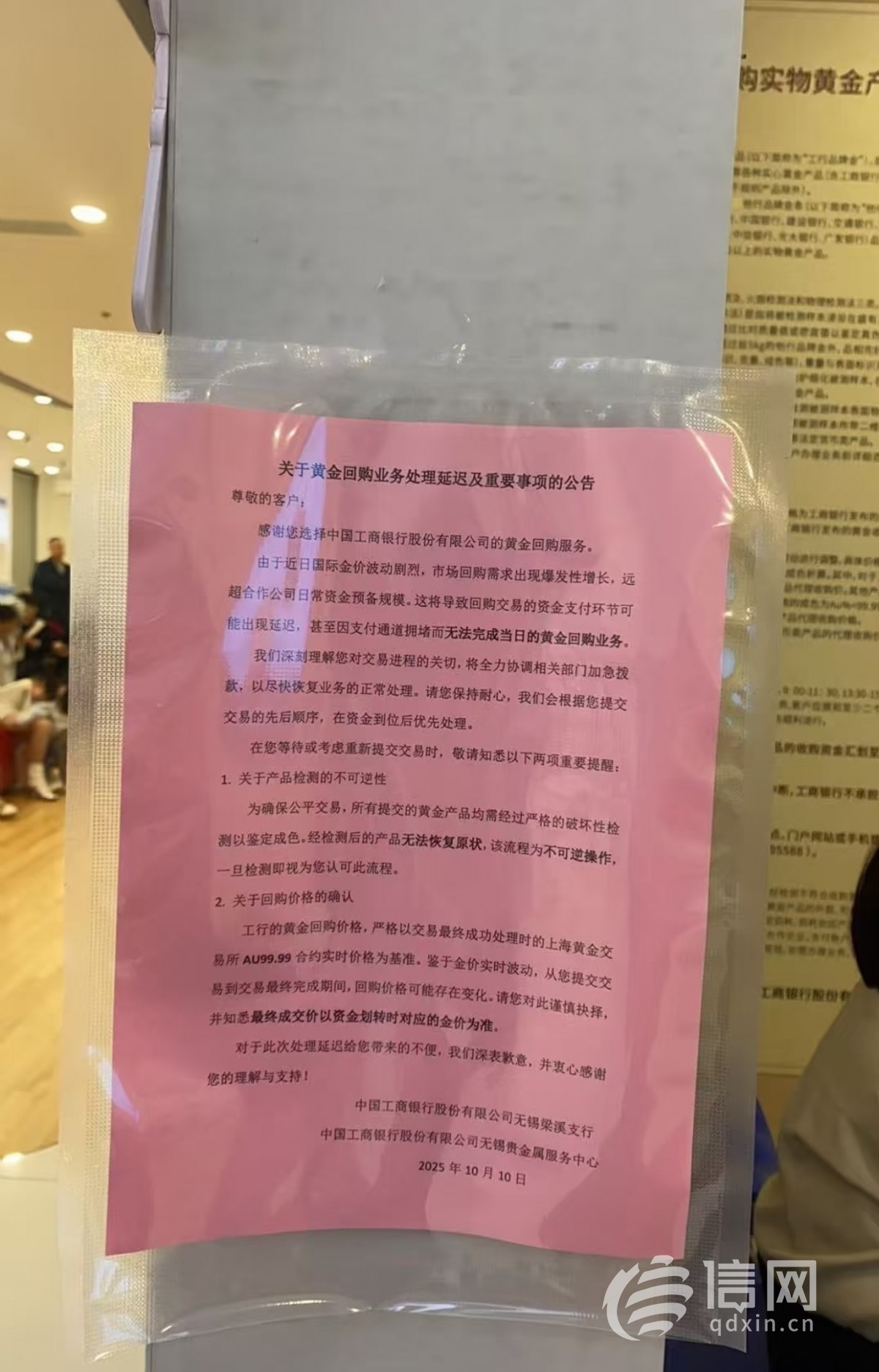 金价上涨背景下,不少市民为及时兑现投资收益,前往银行办理黄金回购业务。10月20日,有网友在社交平台发帖表示,自己前往中国工商银行江苏省无锡市梁溪支行准备办理黄金回购业务,但被告知无法成功办理。他注意到,该行张贴了一张落款日期为10月10日的《关于黄金回购业务处理延迟及重要事项的公告》。