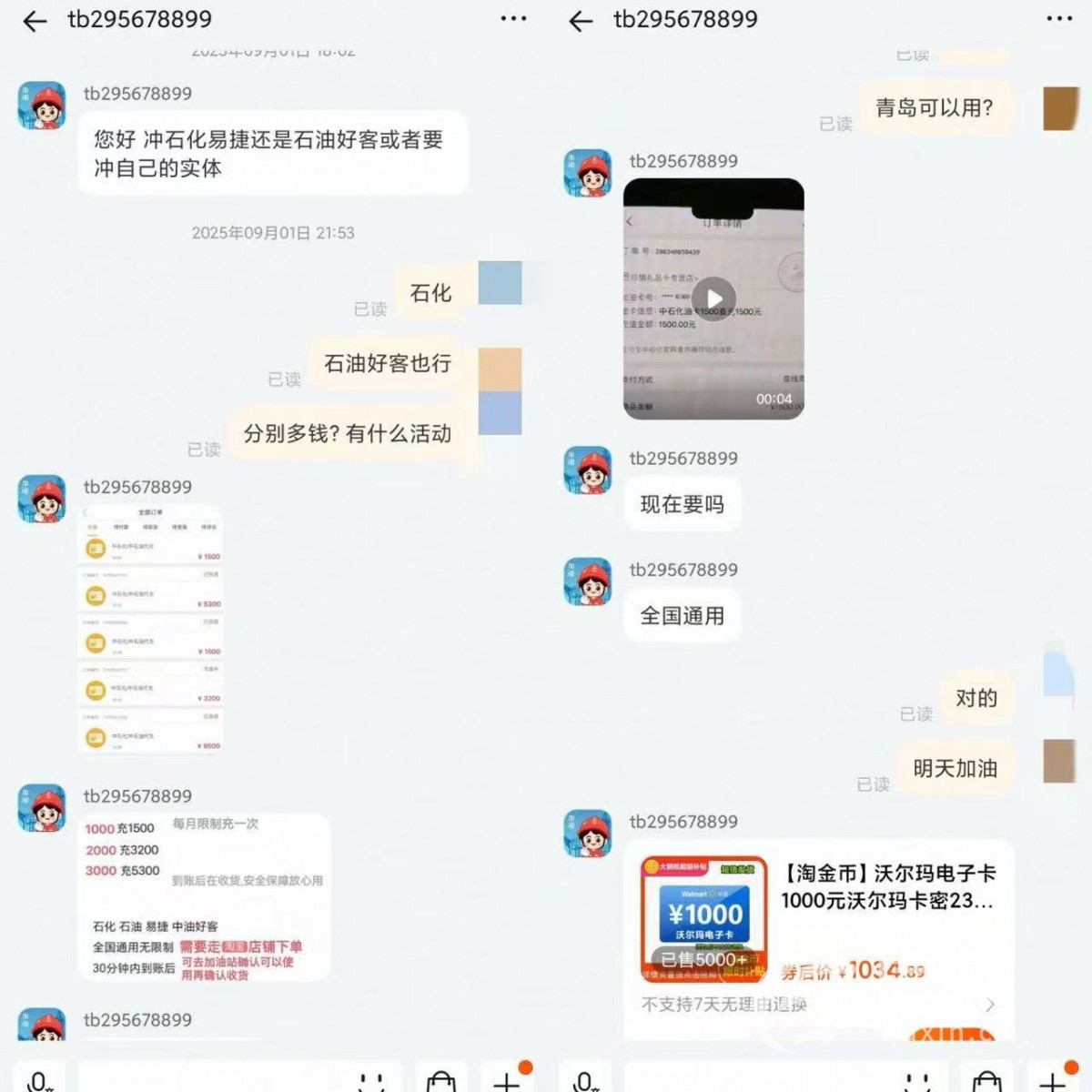 9月1日晚,张女士在闲鱼平台浏览时,被一则“充1000元得1500元加油卡”的广告吸引。发布者声称优惠“全国通用、无限制,适用于石化、石油、易捷、中油好客等加油站”,并强调需通过淘宝下单,可“先确认加油卡能用再收货”。为打消张女士的顾虑,对方还发来了多张“已完成代充”的订单截图与录屏。张女士表示:“我以为通过淘宝平台交易,应该有保障,便放松了警惕。”