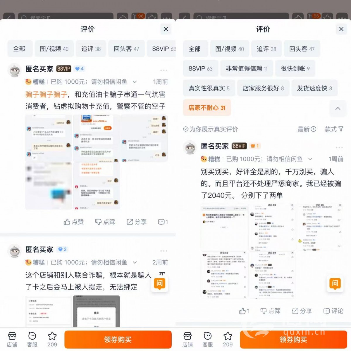 多位买家在评论区表示,他们均是在闲鱼看到“加油卡充值优惠”的宣传,被诱导至淘宝购买沃尔玛电子卡;也有网友后悔向骗子提供了手机号和验证码,最后落得“钱卡两空”。目前,商家已标注提醒:“不能充饭卡/油卡!诈骗人员编任何理由都别信!贪图便宜只会人财两空~尽力劝告了,如还被骗实在没办法。”