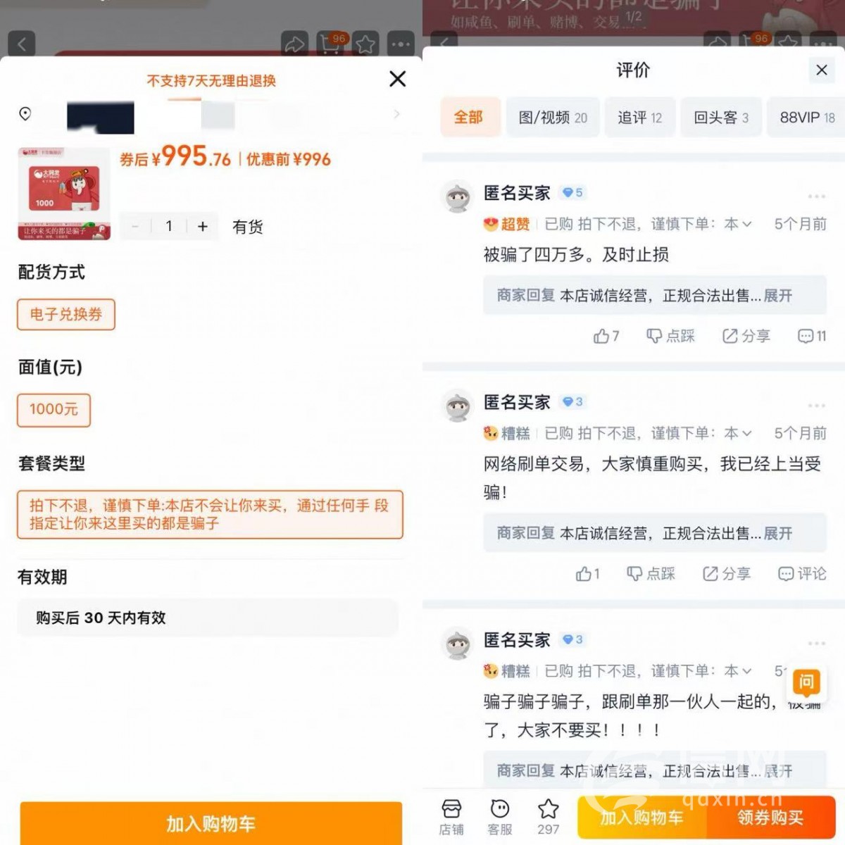 信号新闻在淘宝浏览发现,在另一家经营卡券的旗舰店的评论区内,也有大量买家爆料遭遇被骗,有网友称自己被骗金额高达四万元。该商家也已在商品展示页面配图提醒:“让你来买的都是骗子,如闲鱼、刷单、赌博、交易猫等”,付款页面亦标注:“拍下不退,谨慎下单:本店不会让你买,通过任何手段指定让你来这里买的都是骗子。”