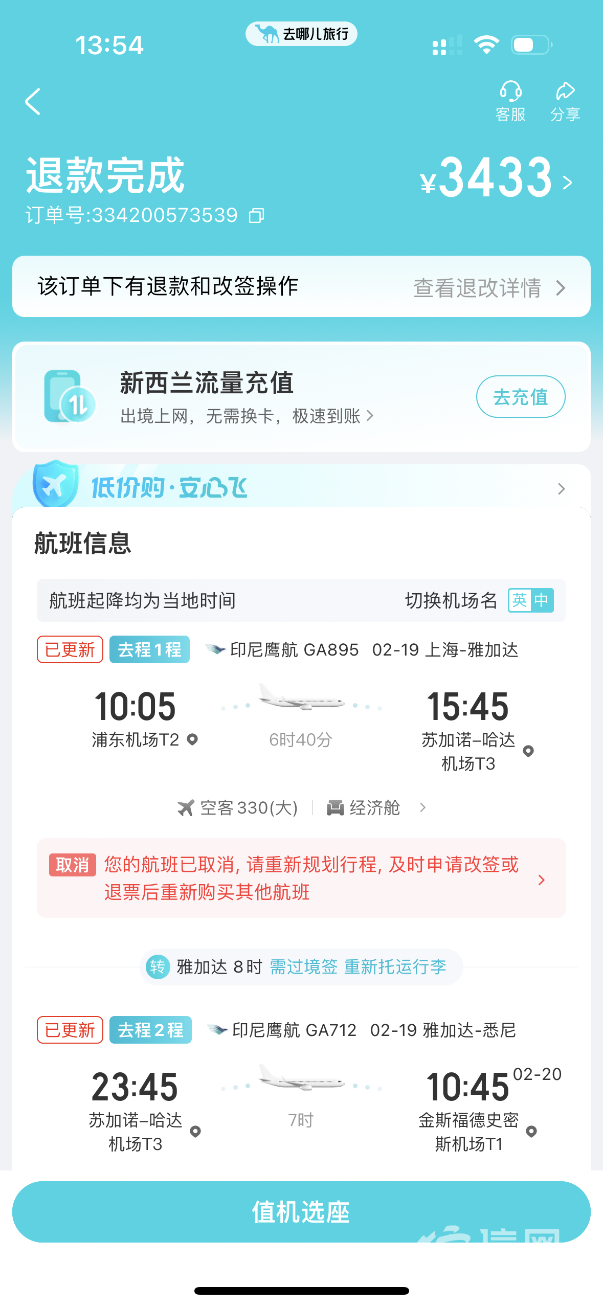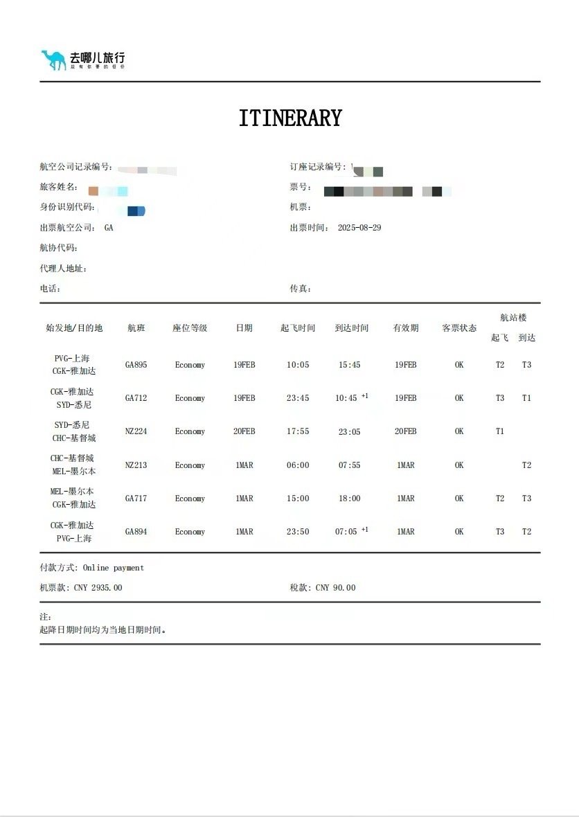 据王女士介绍,她计划2026年春节去新西兰旅行,于2025年8月29日在去哪儿网App花费3443元,购买了上海往返基督城(新西兰克赖斯特彻奇)的联程机票。出发日期为2026年2月19日,途经雅加达和悉尼,总共6段飞行,涉及印尼鹰航和新西兰航空两家航司。