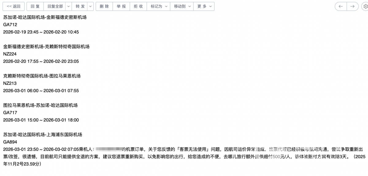 票号所属的另一家公司新西兰航空通过邮件回应,若航段出现变动,航司会提供备选航班方案,但此次订单取消属于第三方代理商的操作,与航司无关,目前该航司执飞的相关航班仍可正常预订。