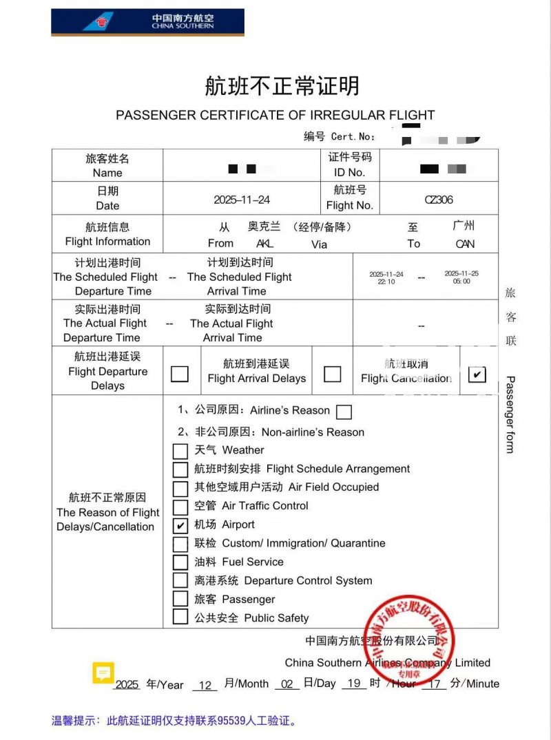 信号新闻就丁女士反映的问题致电南航服务热线,工作人员确认,南航原定11月24日17时10分奥克兰飞广州的CZ306航班,最终因“机场原因无法保障航班出行”取消,该工作人员称,航司后台只查到系现场突发情况,并不知道具体原因,并强调航班取消责任归属机场,航司无相关补偿义务。