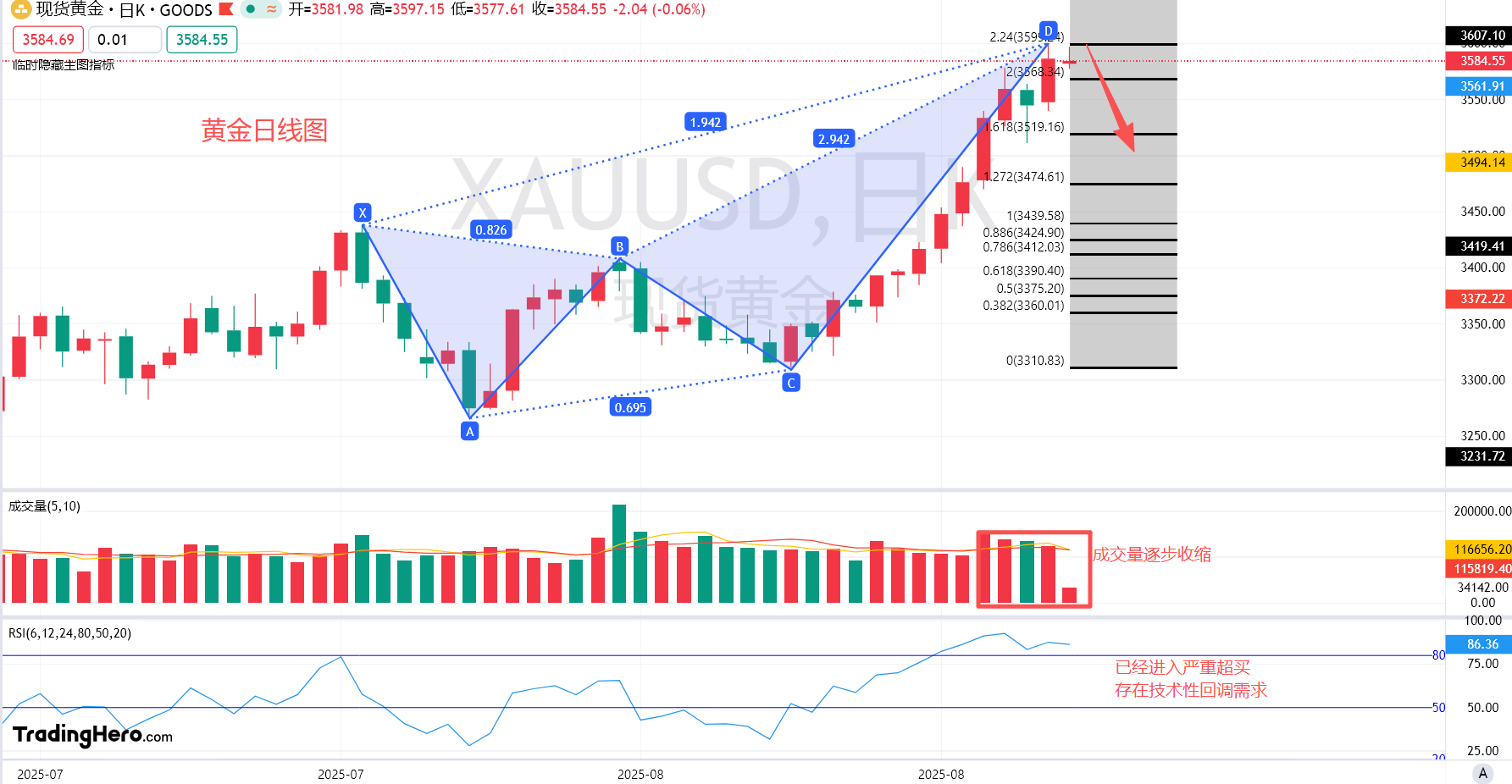 回到技术面分析黄金日线级别盘内走势,先看形态,图中我拉出来了一个日线级别得xabcd走势,不难看出我在日线级别图中的走势当中,我是想要展望着的是在走谐波交易理论,但是形态上看目前已经走出了大力的上涨,收线蝴蝶形态是已经破位了,剩下的能有这么大力度的涨幅就是螃蟹形态了,拉出斐波那契黄金分割线,通过日线级别的七连阳线,加上上周五非农时段大利多数据的提振,主力参与把价格再次向上推升至3600美元关口,同样这里也是斐波那契黄金分割线2.24拓展位的压力。