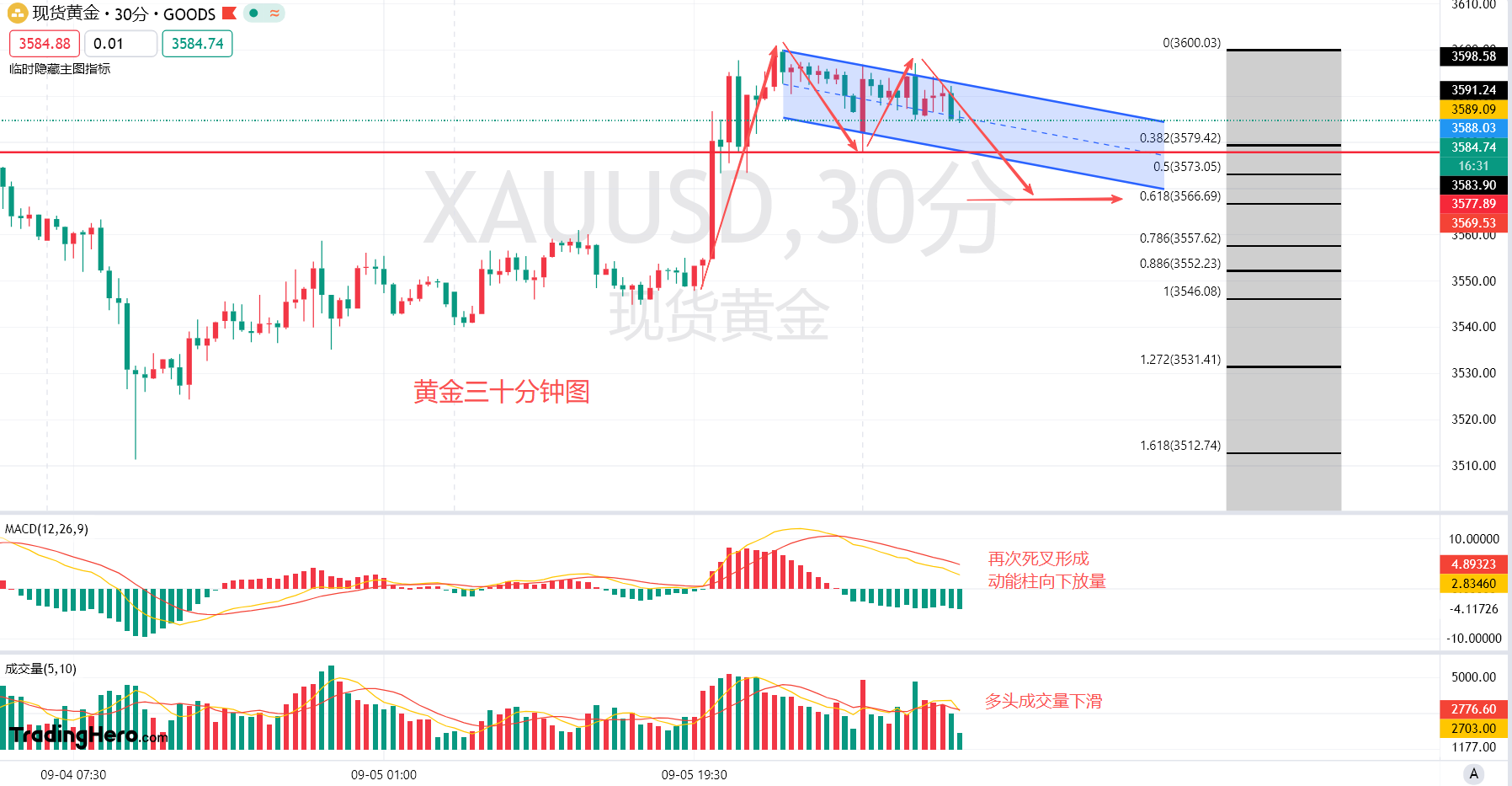 再来看黄金三十分钟图盘内的走势,能够看到黄金冲高至3597-3600附近已经有了两次向下去回调的走势,触及下方3573-3577区间,说明在这个区间是有多头头寸的支撑存在的,上方日线级别我们展望的是在走更大级别的谐波理论螃蟹形态。那么回到小周期来看,如果想要下跌,在这里展望走谐波理论中的蝙蝠形态,从上方拉出斐波那契黄金分割线,此次黄金回落的小周日低点目标,大致从0.382—0.618区间,3580-3567。
