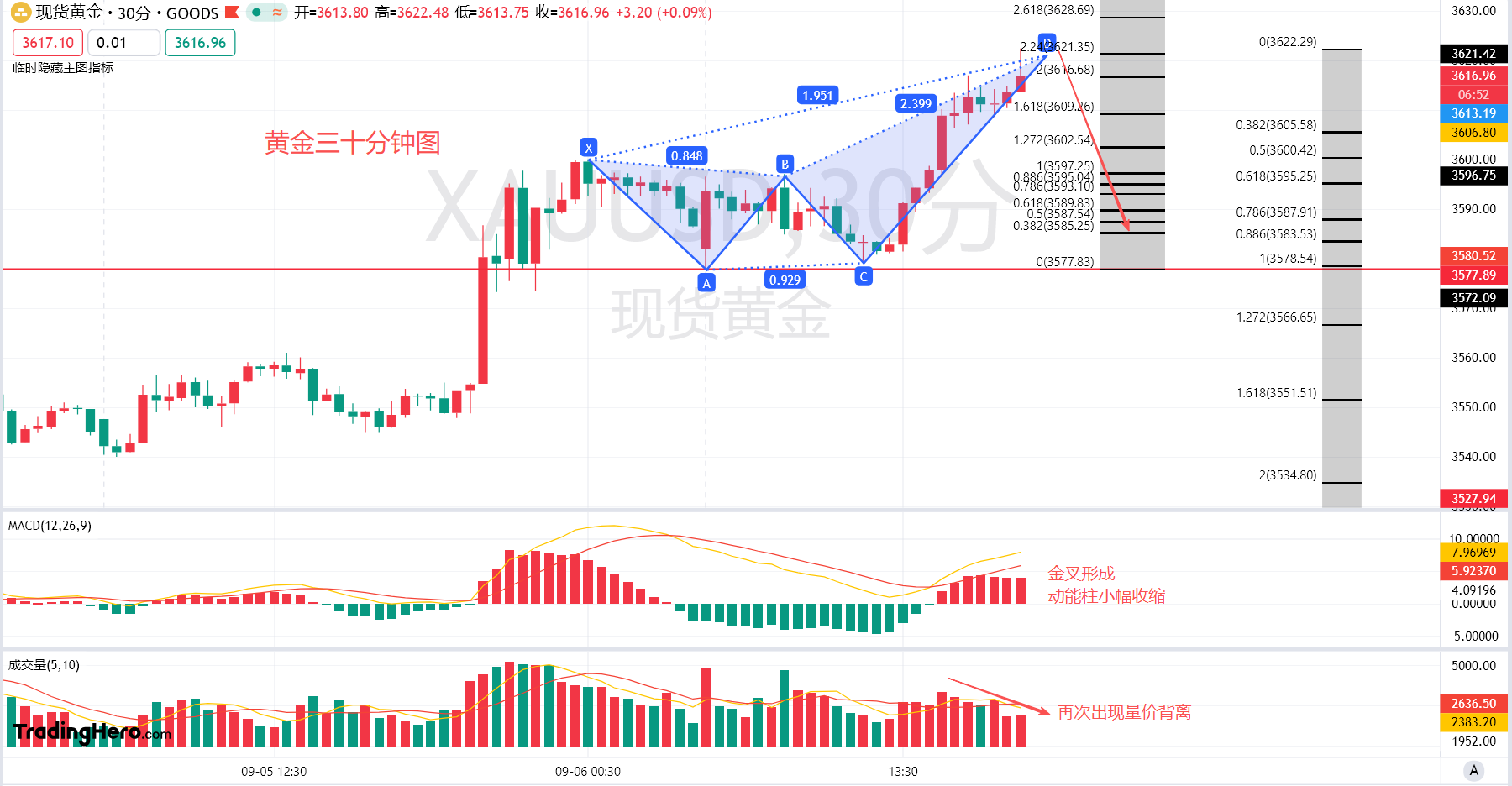 金价这两周可是验证了那一句话:竖起来到底有多高谁也不知道,牛市不言顶,反正就是新高之后的行情,谁也没见过,谁也没有去经历过,单凭一个降息预期炒作到现在,金价已经拉升上来三百美金了,涨跌全靠主力的心情。今天下午,这国际金价3600美元的关口终究还是没有能够守得住,在上周五非农数据疲软之后黄金大涨上来五十美金,我在晚间通知实盘挂单3596去做空黄金,这主力也是听给面,向下有了二十多美金的抛售,一度让我认为金价本次上涨的拐点就到这了,今天上午也是测试到了3600美元关口附近,并没有能够冲上去,但是就到了下午的欧盘时段,金价从3580受到支撑一路慢涨,把3600美元关口打破了,目前盘内最高冲到了3617美元延续震荡,但是能够看出来,主力思路目前还是不想在这个位置获利离场。