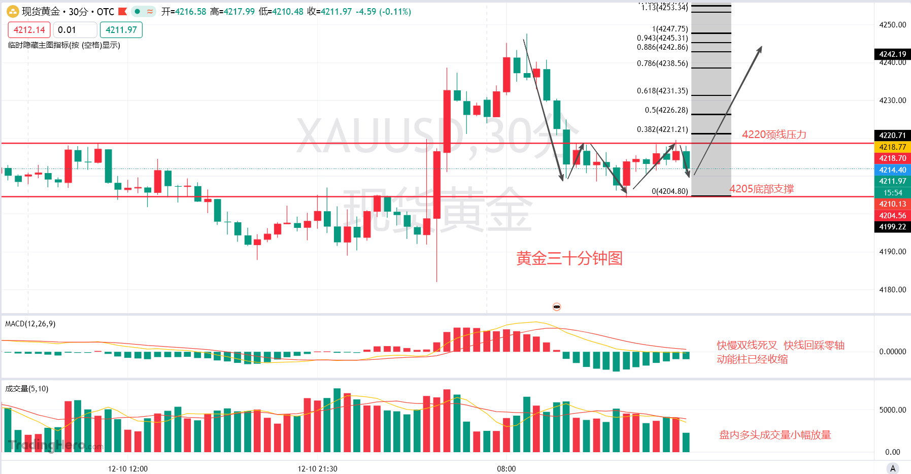 回到技术面黄金三十分钟级别图,能够看到行情从上方4247美元向上冲刺未果向下进行回撤,先行回踩4210的位置走出反抽上行,4219美元再次受阻后向下再次回调测试4205美元支撑,最终形成实体吞没的反转线,图中黑色箭头线表明展望行情走出头肩底形态,下方右肩支撑位于4210美元,可在这里布局多单进场,突破颈线4220美元后关注斐波那契黄金分割线0.618的压力,如果下来回踩4220附近支撑后加仓看向4245美元。