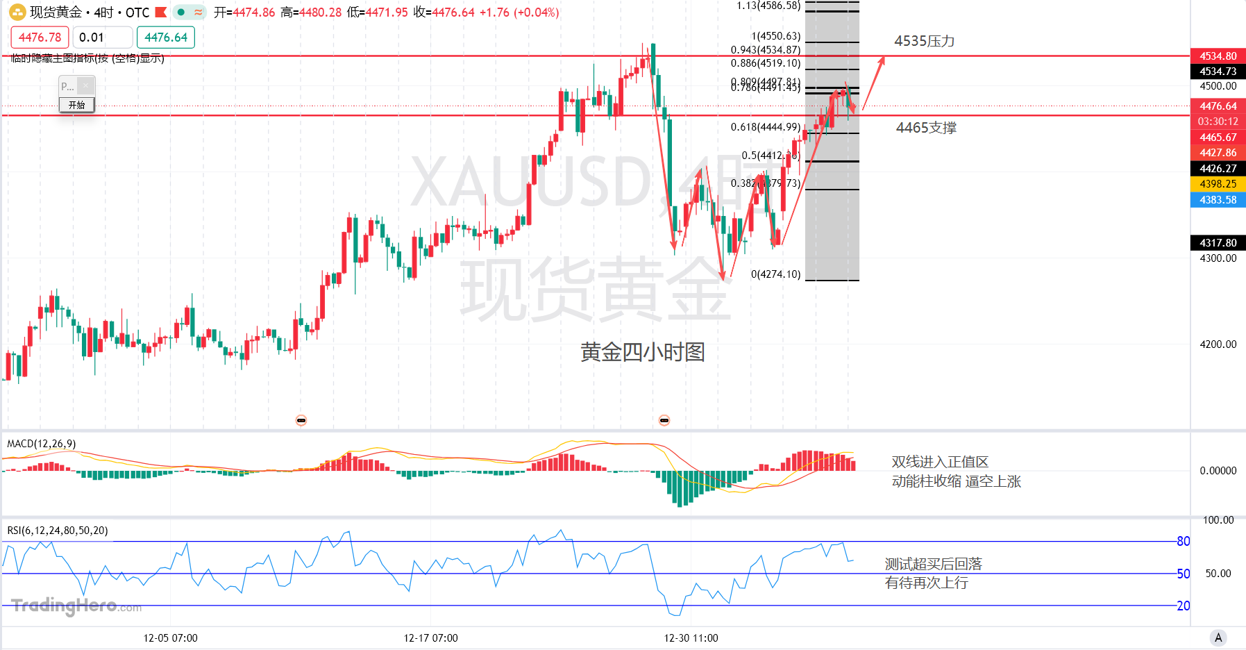 回到技术面盘内黄金四小时级别周期走势,能够看到四小时级别依旧是在走头肩底形态的末端,昨日晚间美盘并没有走出回调,直线向上拉升,收盘于4494美元关口,今日早盘跳空两美金高开至4496美元测试4500美元并未突破向下回撤回踩4460美元关口后震荡上行,但是实体收线于4475美元附近,说明早盘下跌是主力部分离场扫掉追涨止损;当前的金价区间就是4450-4530区间,观察左侧的箱体震荡区间,影线和实体基本都集中维持在4465美元,说明在这个位置依旧有支撑存在。