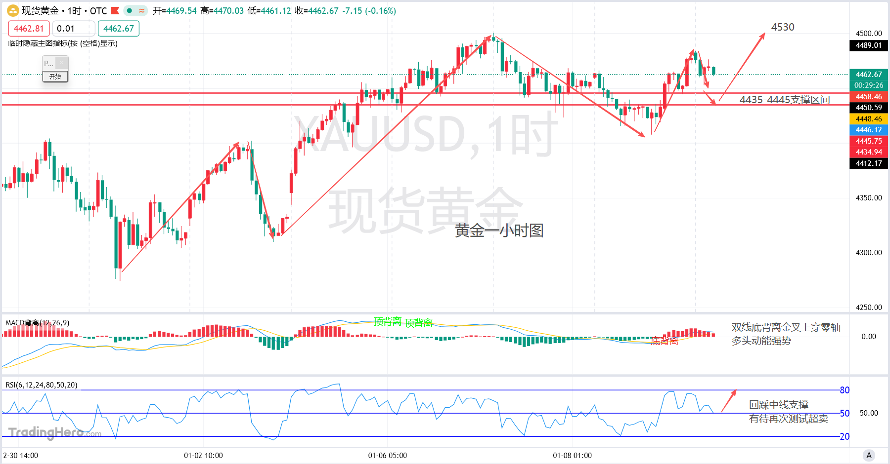 回到黄金一小时级别周期走势,昨晚价格最低回踩4408美元关口向上走出了强势的拉升,收盘于4477美元,今日开盘跳空高开后测试4484受阻向下走出回撤,回补开盘缺口,早盘处于震荡偏弱态势运行。上图当中箭头线表示展望行情走出波浪理论的五浪上行,昨晚回踩测试一浪的高点后拉升,符合四浪回踩开启五浪定义,而这五浪当中细分为五小浪震荡上行,一浪上涨运行4484美元,拉出斐波那契黄金分割线后下方重点的支撑区间在4435-4445美元区间,这里也是斐波那契黄金分割线0.5-0.618区间的支撑,可以在这里布局低多进场。