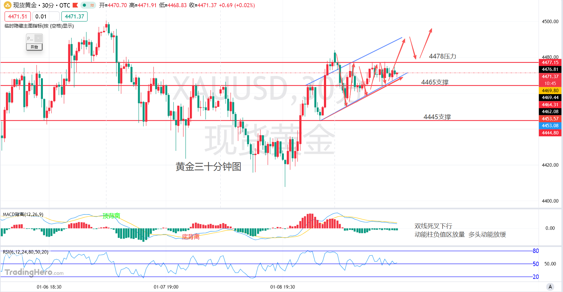 回到技术面黄金盘内三十分钟级别周期走势,能够看出盘内当前是在上行通道之内运行,回调趋势已经反转,但是下午欧盘时段的行情一直再去测试上行通道的下轨部分,能够看出来支撑在逐步的上移,上方的压力集中在4478美元比较明显,但是盘内随着支撑的上移,当前能够看出来是在走一个收敛的三角形,从下方的日内低点支撑4445美元开始,到上方的压力4478美元,震荡区间有三十美元左右,按照突破4478美元后再往上涨一倍量或者二倍量的幅度来看,上方的压力区间在4505-4530区间。