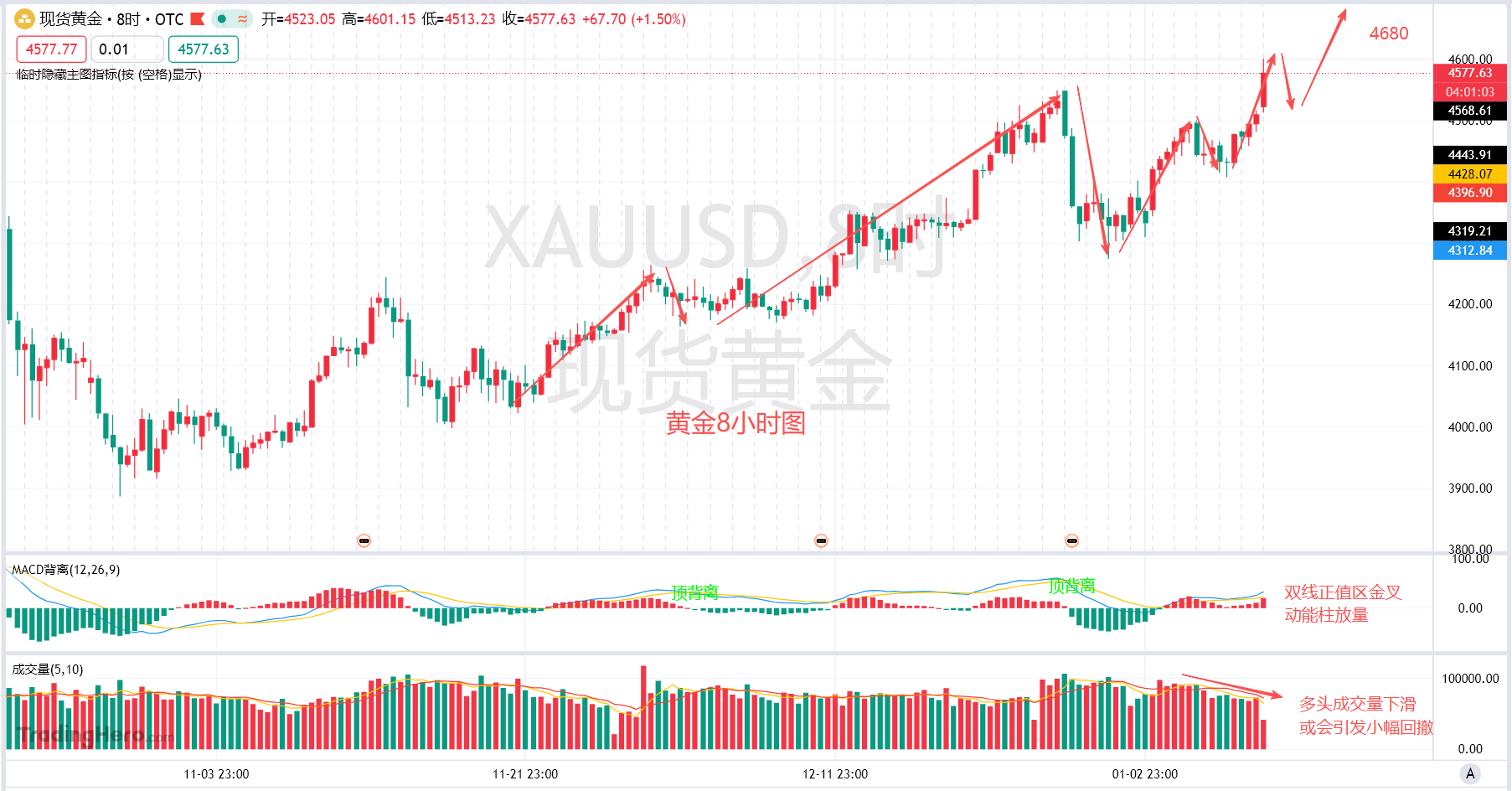 这黄金又把新高给刷新了,士隔三日当刮目相看,过了个周末停盘,今天一大早金价开始冲刺4600美元关口,兄弟们,这黄金还是你认识的黄金吗?还有要看黄金下跌吗?上周说了黄金真正的加速上涨还未到来,这周一开盘就拉起来了,这行情,哪怕上不去车也不要去做空,回撤下来就是我们上车的机会。从今天的行情走势能够看出来,开盘就跳空高开随后高走测试到4601美元之后多头动能阶段性减弱,从开盘后到阶段性回撤,将近九十美金的涨幅就说明了有大批量的资金流入到黄金市场当中参与逼空,在上涨的时候突破了前方新高点后就没有所谓的压力位置,都是畏高心理在作祟。这一点从做单里边就能够看出来,不出意外今天早上会有很多在4550附近前高压力位去做空失败的吧,如果能够及时止损离场还好,一旦选择扛单那就是在和主力去做对抗,在这个胳膊拧不过大腿的市场,上涨的结构当中哪怕我们没有参与上,尽量也不要去做空,而是选择回撤下来去接多。