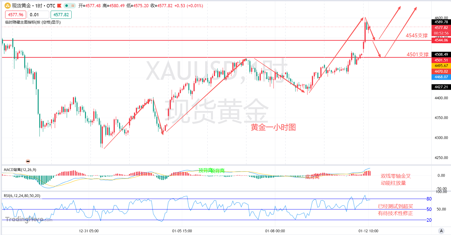 再来看黄金一小时级别周期图走势,在上周三晚间回踩4408美元后走出上行,这也就是说明行情在走波浪理论当中的五浪上行,四浪回踩的位置刚好位于一浪的高点上方,符合波浪理论的定义,上周五晚间非农落地后突破了4500美元的强压制,今天跳空高开再次高走,小幅逼空的行情已经在盘内出现,下方关注前高附近4545美元的支撑,行情在这里走出了小幅的震荡,如果在下午欧盘或者晚间美盘回补到下方跳空的缺口后,关注4501美元的前高支撑买涨。