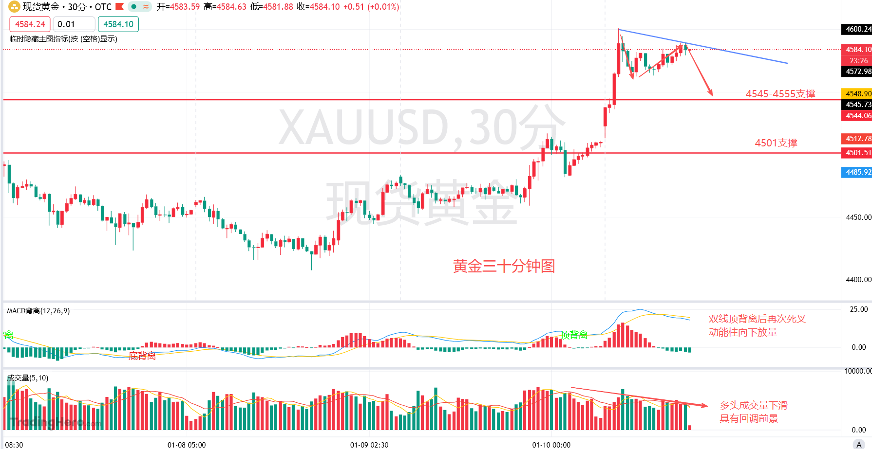 在今天上午的文章当中给出的思路是继续看涨,但是不能直接去追涨,回调下来去接多,两个参考的支撑到目前还没有能够测试到。但是再下午的欧盘时段行情震荡向上小幅走高运行至4590美元后再次受到压制这个预期是有的。从上午国内沪金开盘之后价格向下走出回调之后并没有继续高走就能够看的出来,有小批量的资金从市场当中流出了。这一点从白银就能够看出来,当白银运行到新高附近后受阻,向下走出小幅回撤,后续再次高走一举拿下新高之后再次震荡。而黄金盘内在走出回调之后,白银继续冲高时黄金并没有延续强势的上涨,这也就是说有部分机构或者是散户出现了获利了结的现象,至少能够体现出来资金没有再流入到市场当中。但是在前方说了,思路还是继续看涨,也就是说明这一波的拉升到4601美元后受阻并没有到达我的心里目标区间,向上还有50-80美金的涨幅之后再去寻求看走出回调。