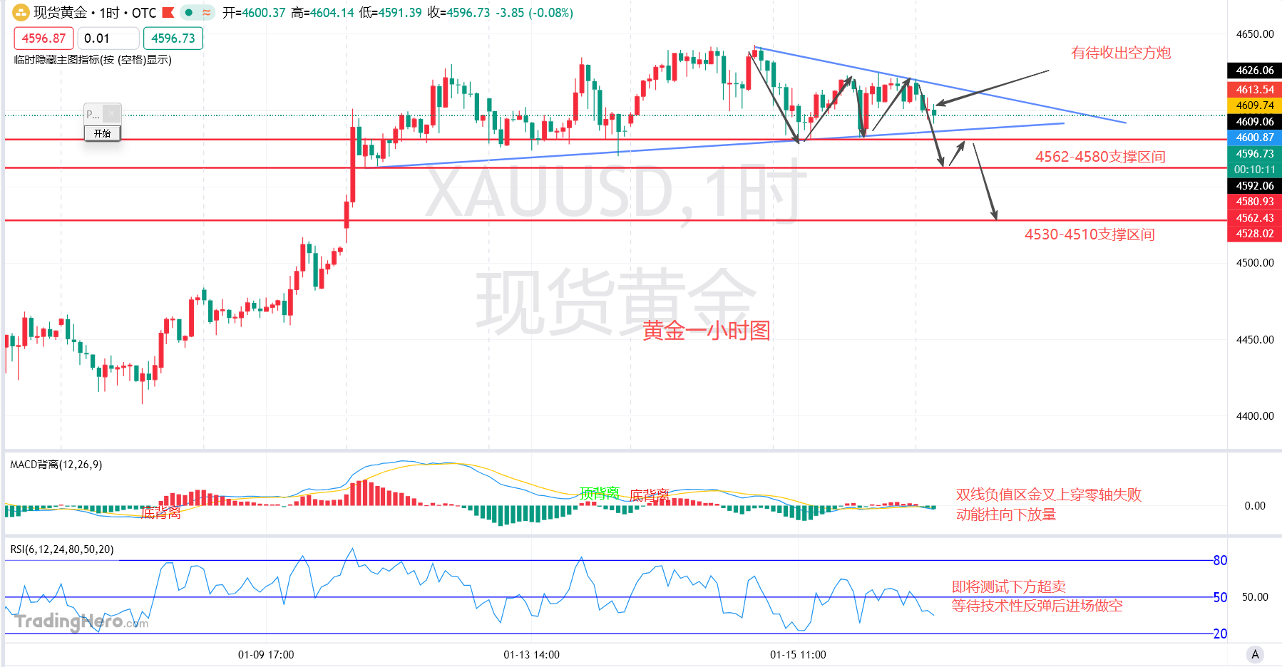 参考压力区间:4605-4610美元进场做空,止损4621美元,目标看向下方4580-4550-4530,行情运行至第一目标区间后做减仓处理,破位后继续持有。