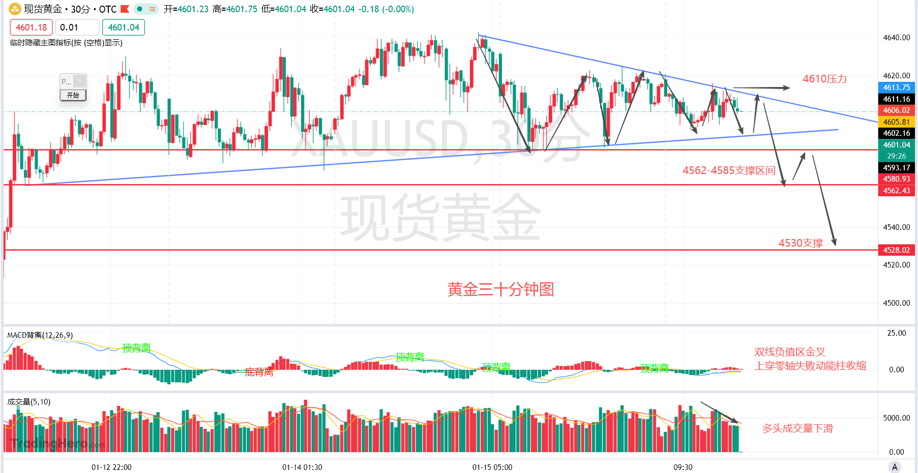 回到技术面盘内黄金三十分钟级别周期图,能够看到今日盘内的走势从今日开盘之后跳空高开高走了两美金之后日内的高点截至拟稿时段最高运行至4620美元受阻,随后就呈现弱势运行向下用实体回补缺口,中午午盘时段多头动能突然增强向上拉升至4515美元关口,但是实体收线于4611附近,后市呈现多头动能减弱,考虑是白银盘内拉升导致黄金跟涨,主力机构扫掉4600美元关口附近做空的散户表现。