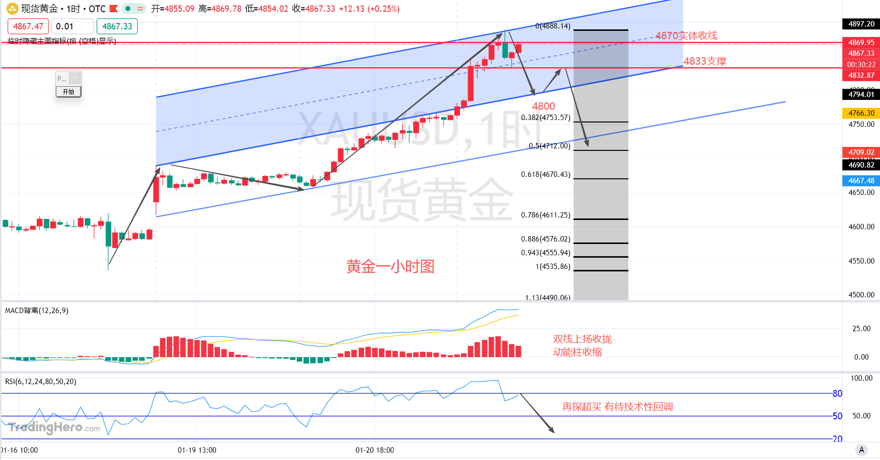 回到技术面盘内黄金一小时级别周期走势,能够看到行情从上周五晚间美盘向下走出下行回踩4537美元后向上走出强势拉升,上图当中展望行情在上周五再次开启升浪的前提下,伊朗的高点运行至4690美元后震荡,后续直接强势上涨至今日亚盘尾盘,运行出上影线测试4888美元后向下走出回撤,实体收出吞没的反转线,三浪的上涨考虑阶段性结束,并且实体收线于4870美元,在这里形成上方的压力区间。拉出两道上行通道后,上方通道的下沿趋势线是前方实体运行出来高点的压力,突破后演变为支撑,破位4835美元后看向4800美元附近支撑情况,如果行情持续向下抛售,拉出斐波那契黄金分割线,参考升浪的0.5半分位附近的回撤支撑4712美元看涨,同时这里也是一浪的高点附近。