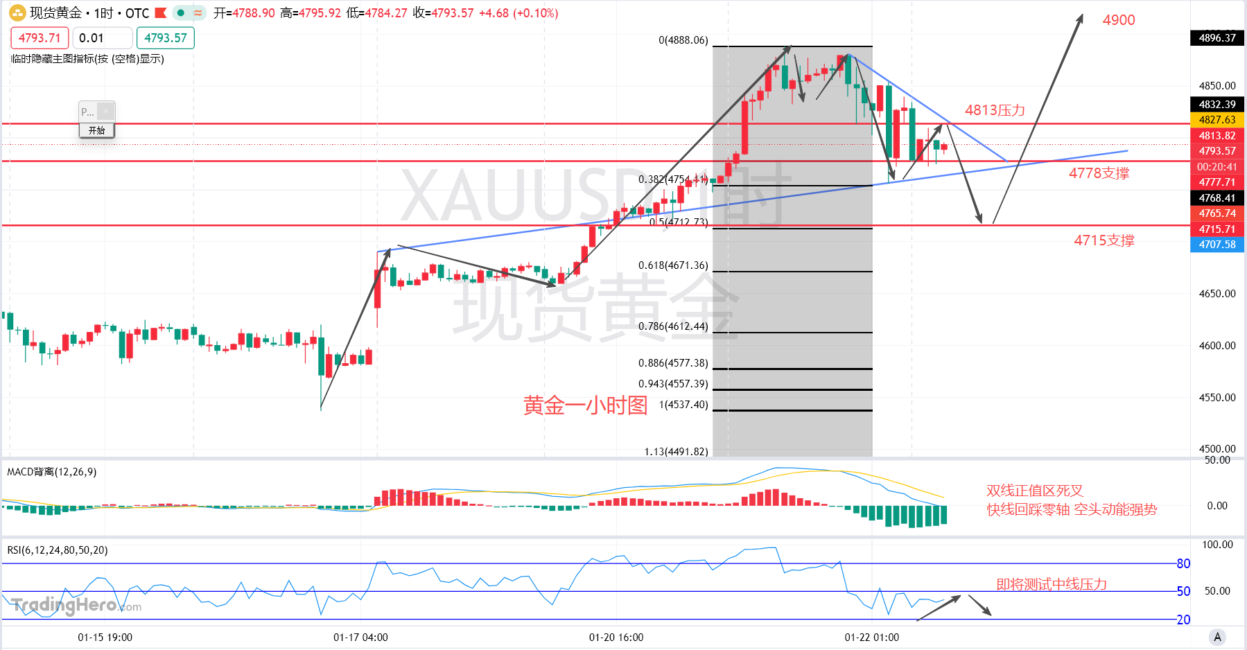 MACD指标快慢双线在零轴线之上正值区形成高位死叉,昨晚欧盘至美盘时段行情向下走出连续的抛售,双线向下延伸目前已经运行至零轴线附近,动能柱同步向下放量,空头动能阶段性强势;rsi指标供需曲线也已经运行至中线下方,压力较为明显,日内高空为主,观察上方4813附近的压制进场做空,晚上美盘时段展望向下破位。