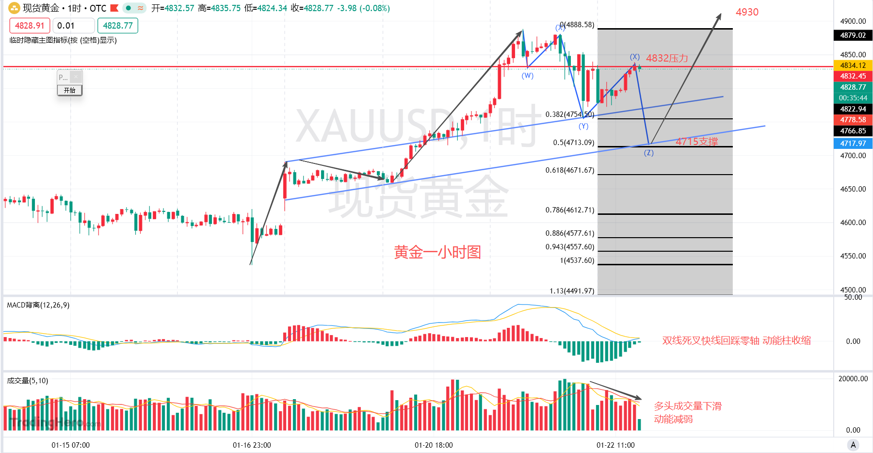 就目前的行情来看由于昨晚的美盘时段国际黄金向下走出了大幅的抛售,很多人以为这是川普讲话的功劳,不过也确实有,在我看来川普是在释放烟雾弹,市场当中的消息并不是给我们听的,而是给主力机构或者是地缘局势的当事国听的。虽然强调了不会武力夺取格陵兰岛但是在我看来这件事情才刚刚开始,对于金价回调在直播和上午的文章思路里也明确的讲了,回调就是倒车接人,但是并没有到达我的目标支撑,争议是有的,接下来就让盘内的价格去走出方向就行。在今天的交易当中上午亚盘时段看到黄金一小时级别周期虽然价格有下行破位,但是实体基本上集中于4780附近收线,所以在这个位置开出了多单,上方的目标也没有看的太远,中午时分把多单离场了,拿了二十个点。考虑到行情震荡偏弱继续走回调的原因,下午直播当中看到盘内十分钟级别周期运行出来了倒垂的反转线,并且成交量也有所放量,随机进场南下,十个点的止损被市场清理出局,随后又在4834美元二次进场做空,截至目前拟稿时段已经有了十个点的利润。晚间的美盘时段是重点,能不能向下走出回调也就是每盘棋道决定性的影响,后市如何进场请看下方技术面跟进。
