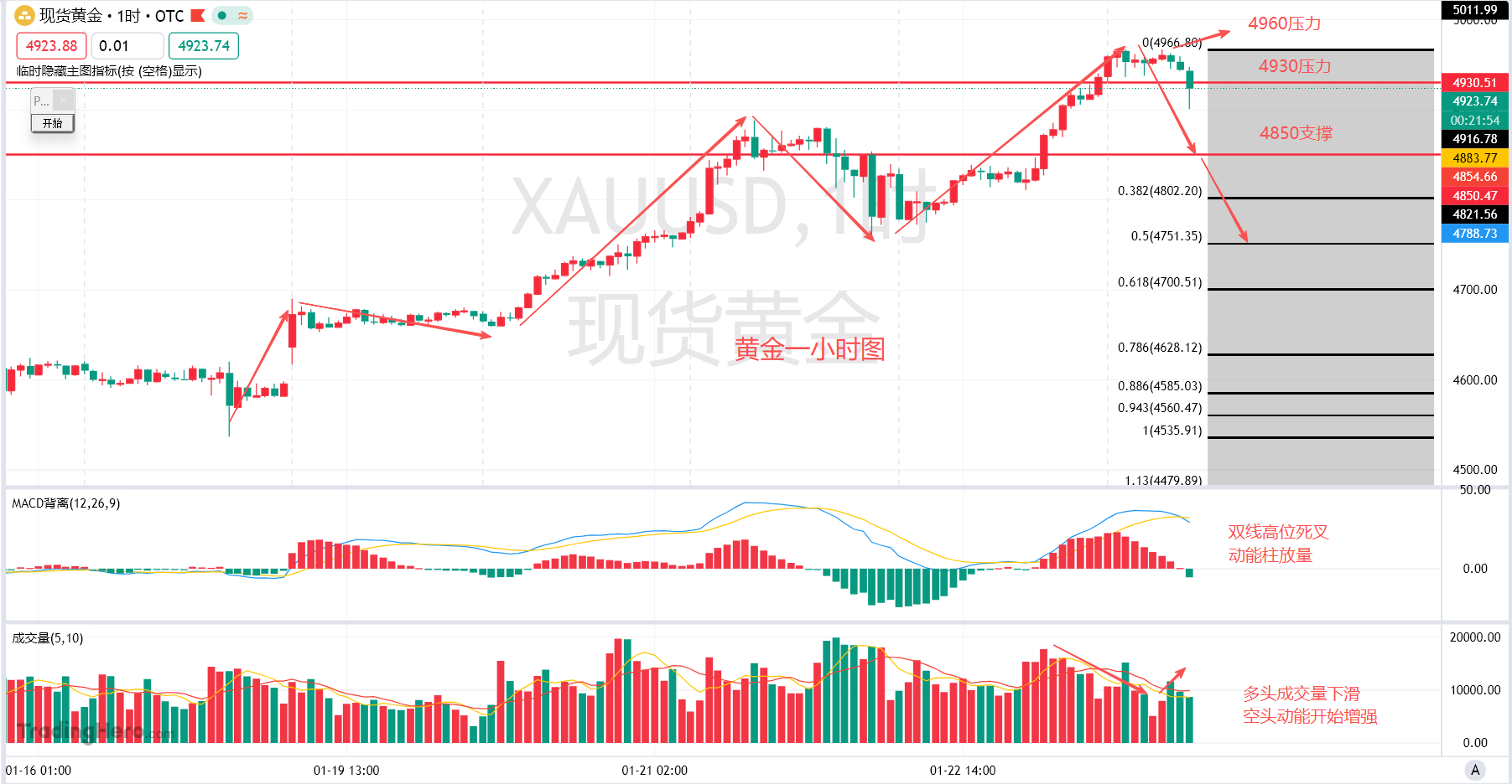 今天这黄金再一次的把近期的前高打破了,截至目前拟稿时段金价最高交投于上方4967美元受到压力后呈现高位震荡态势,出现反转的时间是在昨天的亚盘午盘,盘内行情由跌专涨重新把价格拉回4840美元之后就一路震荡等待晚间美盘时段主力的再次选择。本次回调之后的上涨行情是有预期的,由于我看四浪回调的幅度没有达到我的目标,所以这一波的上涨只拿了二十个点左右的利润就下车了,当成震荡去做了。加速上涨的行情在昨天晚上的美盘时段,也就是十点之后行情加速向上破位,站上4860之后整晚再也没有下来过,最终收盘于4936美元。今天早亚盘开盘之后行情再次向上拔高,两个小时的时间向上拉升的幅度三十多美元,但是就在国内沪金开盘之后,第一波的资金向外流出了,五分钟的时间把国际黄金盘内的价格砸了30美金下去了,也算是确定了盘内的高点压力,给了我能够去做空的思路进场位置。