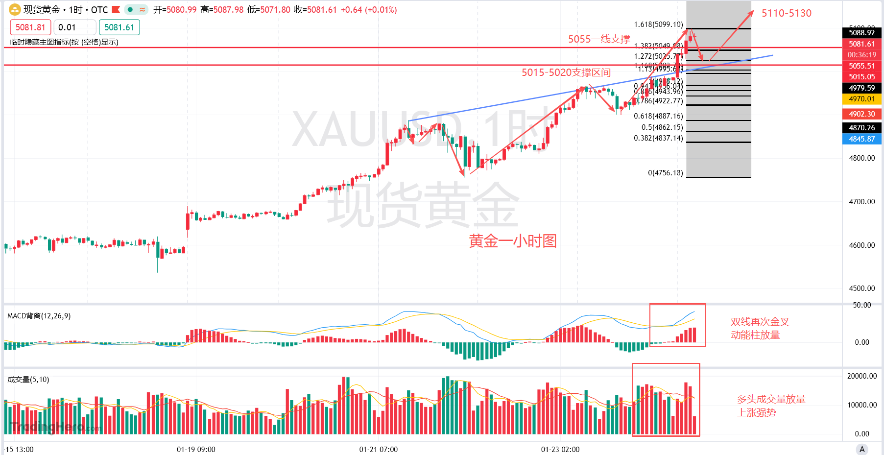 这黄金每一个周末过后的开盘就能给你制造一些惊喜,今天又是一个高开高走的周一。上周五这金价冲高4960之后向下走出了回调到4900美元关口,今天的金价跳空高开突破5000大关,又涨上来一百多美金了,截至目前拟稿时段黄金日内冲高到了5093美元每盎司,就这还没有看到有想要回撤的迹象,能够走到那谁也不知道,这个回调还是等等再看吧,每天都在新高路上的黄金,上一分钟可能正在洗盘,下一分钟就能够反抽上来。这金价的上涨按照这样来看加速的上涨或许还在后边,由地缘局势升温打开了金价上涨的导火索,直到现在这些问题还在延宕并且没有看到有想要降温的现象,就是一直有这个要打的预期,但一直不打,在这种情绪之下一直提振着避险资金流入黄金市场当中,这也是现在的金价向下走出快速回撤之后就能够在次拉升上来突破前高,跌不下去的原因,这可是应了那一句话:每一次的回调都是上车的机会,但是狼来了这个故事不知道还能够再出现几次。