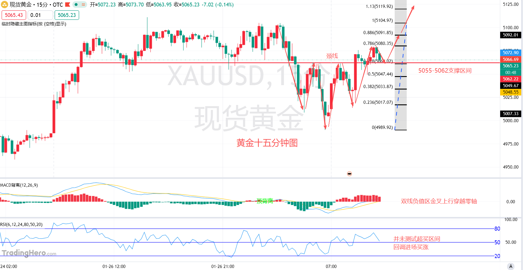 再来看盘内黄金十五分钟级别周期图,能够看到昨日行情在晚间美盘尝试向上再次突破日内前高5111美元后未果向下走出了巨量的抛售,收盘之前回调最低触及4990美元收到支撑后反弹起涨,上图当中箭头线表示展望行情走出头肩底形态,当前已经运行至5080美元受阻,上方关注5092美元的压力情况,如果无法突破回撤下来回踩5055-5062美元区间后进场买涨,突破颈线后向下回踩颈线再次起涨,上方目标看向突破5100美元。