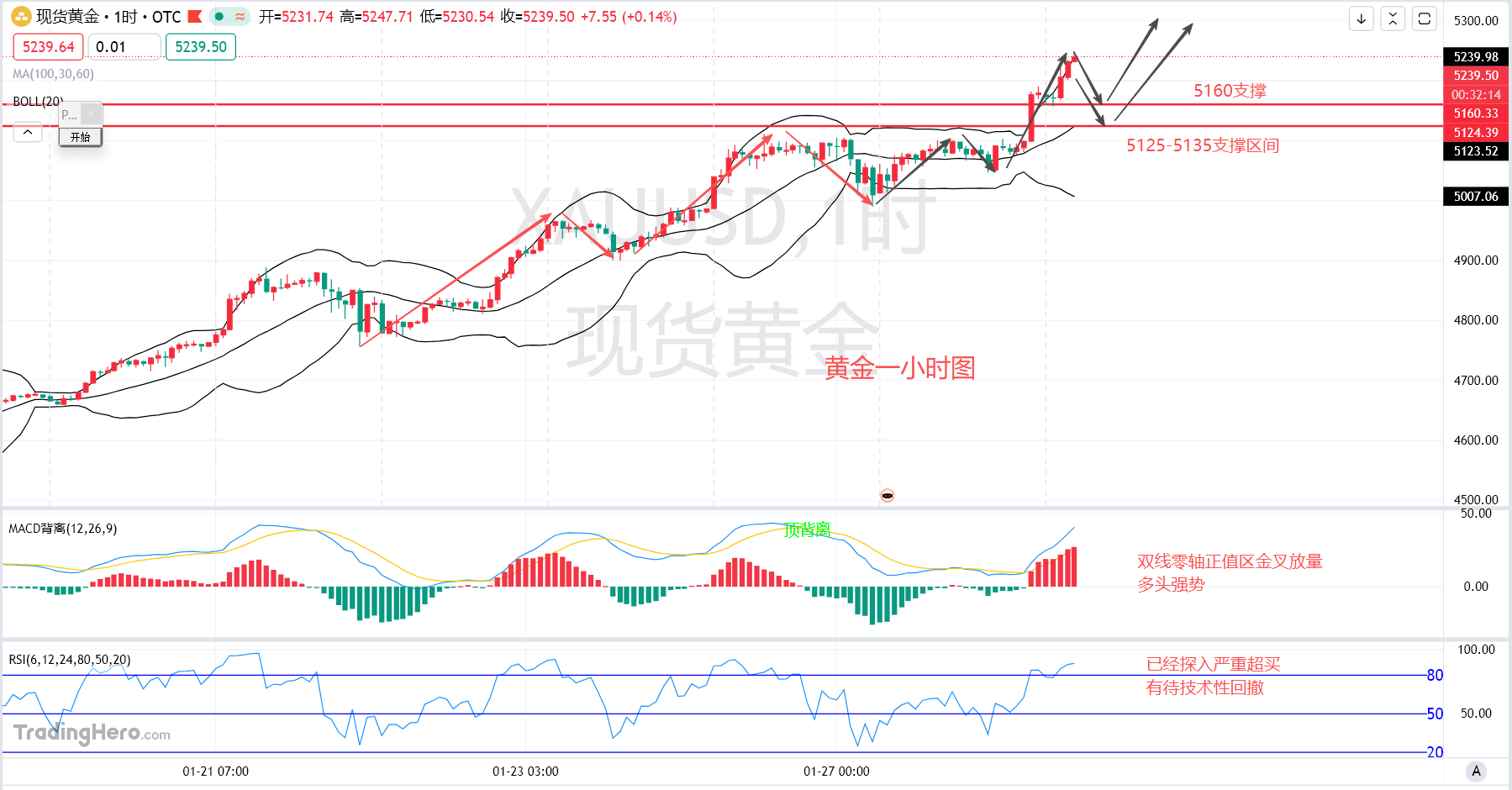 这黄金涨起来没完了,连我这个看涨的都觉得有点过分了,昨天的价格还在50开头晃悠,也就是说上涨的目标看到5200,没想到这隔夜金价暴涨上来一百美金,今天早上这5200的目标就到了,还会涨吗?都这样了被动继续看涨吧,但是不要在高位去追,急涨的时候是先行锁定利润获利的时候,回调下来再去接。从技术面上来看一小时级别盘内,从4990开始向上走出五浪上行,但是这五浪的力度现在来属实超过了预期,短期内金价仍有上行空间,那么问题来了这一波急涨是真突破还是假冲锋?从态势上来看昨晚的美盘时段明显时想要洗盘清洗掉追涨的散户半夜拉升偷袭,这就是典型的洗盘操作,昨晚的行情美盘时段直线向下跳水六十美金左右足够扫掉多数人追涨散户的止损了,这就是主力的预期想要向上拉升但是车上一同向上的人太多怎么办?先往后退,一边回撤一遍扫止损,给到低位了吓的一些散户也不敢去追了,达成目标之后就快速的反抽上行,这就是标准的洗盘式的上涨。