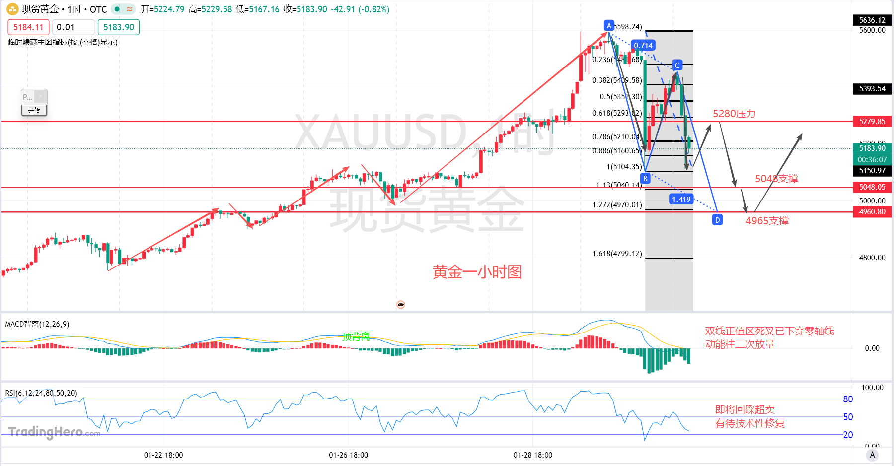 昨天晚上这一波回撤不出现,我还真以为黄金只会涨不会跌呢,历史性的单日最大跌幅出现,一个小时重挫五百美金,眼看它起高楼,眼看它楼塌了,但是眼看它又盖起来了,这黄金市场已经到了疯狂的地步,一个小时重挫五百美金,上杠杆的不知道有多少人一念之间陨落在黎明之前,昨晚的直播下播之后有些许粉丝私信我,大金我账户归零了,看到之后只能往而兴叹,昨天早上就说了谨防主力拉高出逃,晚上直播更是提醒风险,可能在一些投资者眼里看到的满是追涨的热血,但是我在我看满是危机,好景不长下播后这抛售就出现了,向下回撤5100企稳没有砸穿,有在5100上车的恭喜喜提大路虎,但还是别高兴太早,及时的锁定利润,行情来的太快,在我看来这行情没个两三天是稳不住的,今天早上这金价最高冲高5450美元每盎司,正在写文章的时候就已经从日内的高点向下走出回撤200多美金来到了5200美元附近晃悠,看起来并没有企稳的迹象,一分钟五十美金的波动,作为一个合格的韭菜,这个时候就应该老老实实的的观望,没有这个金刚钻,瓷器活是揽不住的。