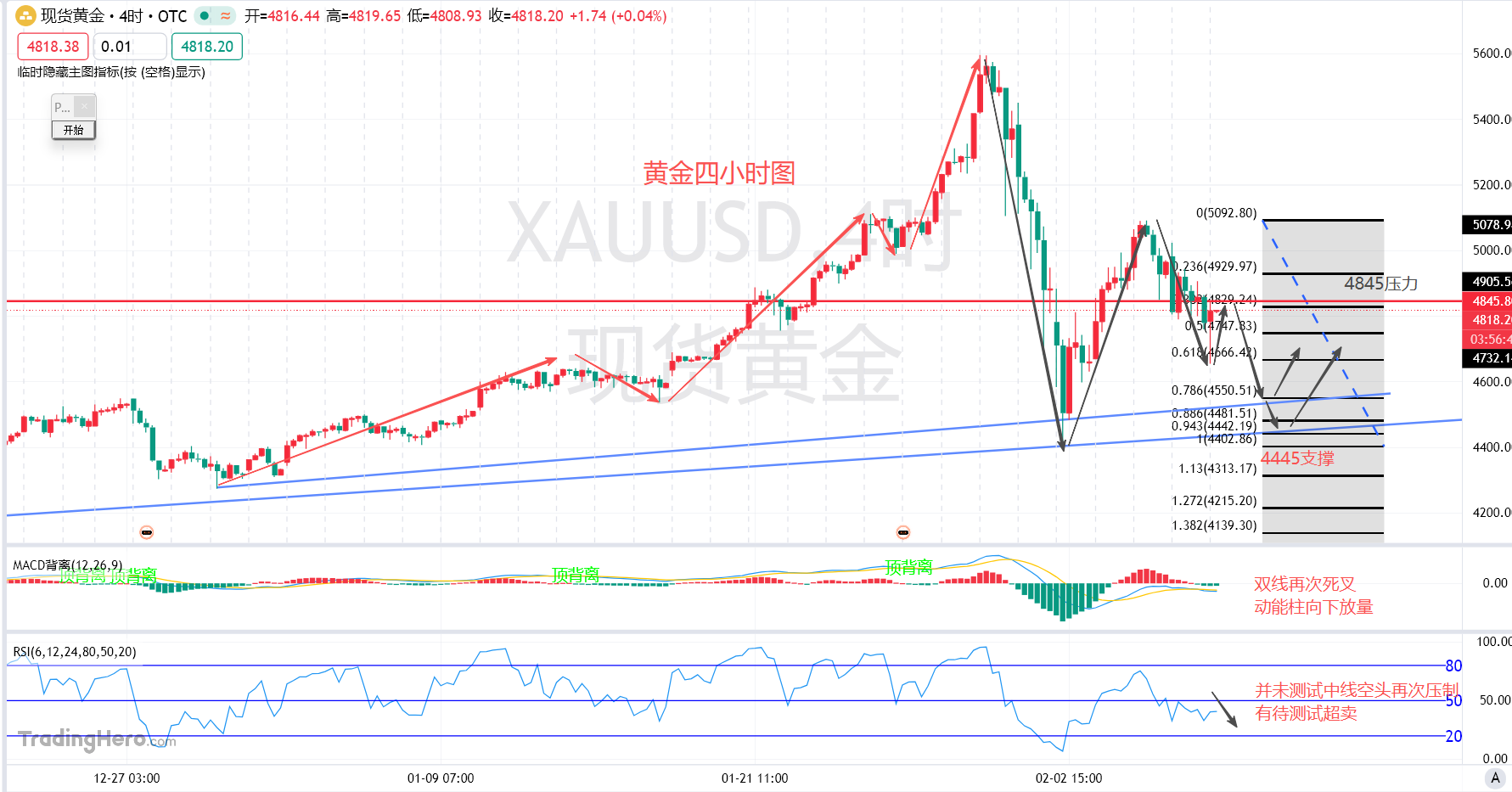 回到技术面黄金四小时级别周期走势分析,能够看到行情自高点5596美元走出巨量下跌至4403美元受到支撑反抽上行,能够看到在上方图中我用黑色箭头线表示展望后续行情的走势,4403-5092美元这个区间走势用波浪理论来看是走出了回调浪当中的B浪反弹,现在的行情已经跌破5000大关后是走出了C浪的回调下跌,拉出斐波那契黄金分割线之后,重点选取0.886和0.943附近的支撑上车看涨,同样这里也是下方上涨趋势线的支撑附近,区间点位选择4530和4445美元看涨,而上方的压力选择4845美元进场做空。